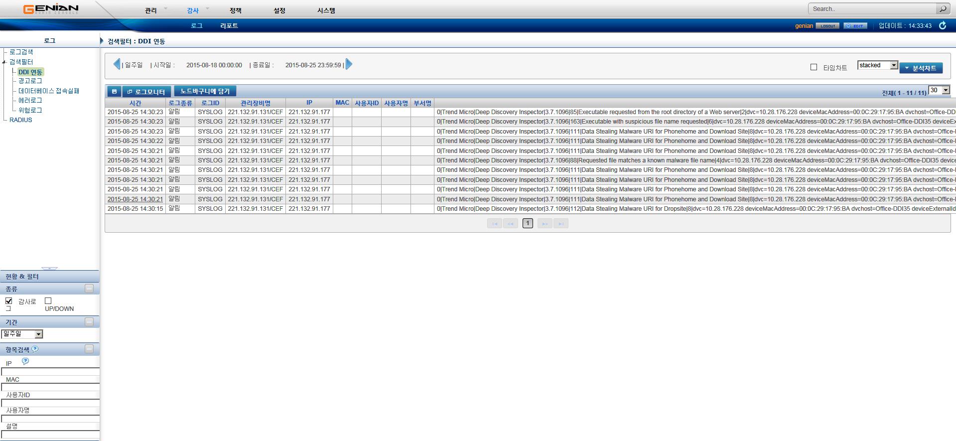 DDI에서 SYSLOG 전송설정이 완료된 상태에서 Genian NAC Suite에서는 해당 로그를 받을 수 있도록 필터 설정을 추가합니다.