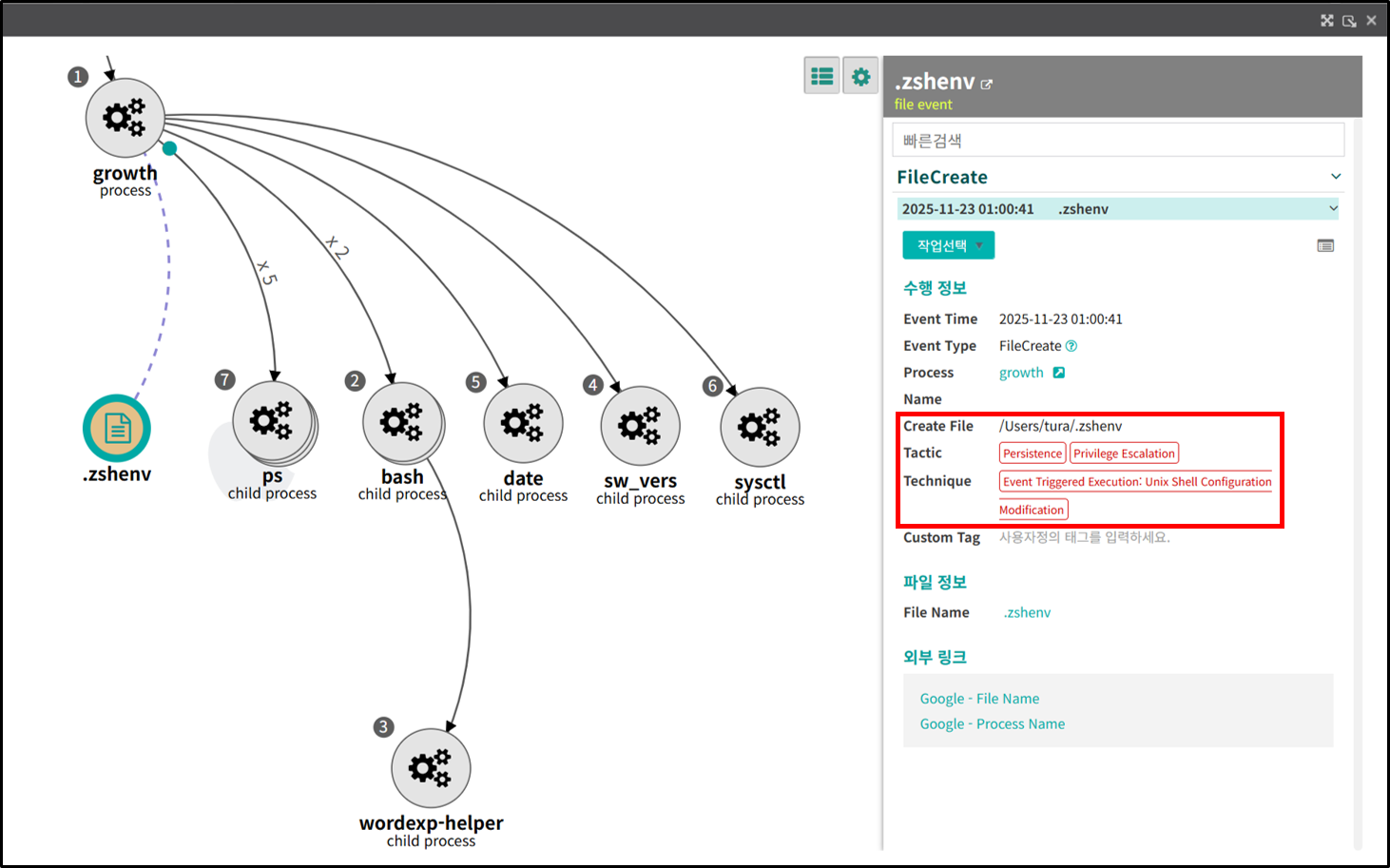 Genian EDR에서는 지속성 확보를 목적으로 생성되는 zshenv 파일을 MITRE ATT&CK 태그를 통해 탐지하고 있으며, 위협 스토리라인을 통해 악성코드의 추가 행위까지 확인할 수 있습니다.