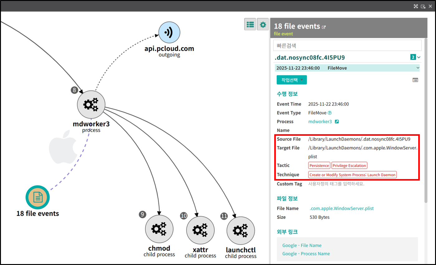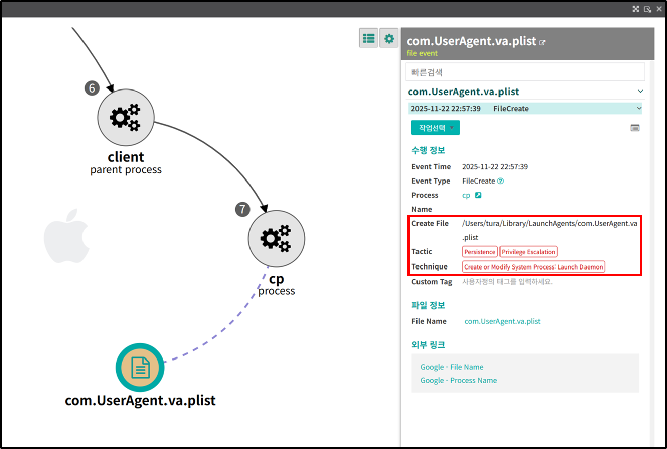 Genian EDR은 cp 명령을 통해 /Library/LaunchAgents 경로에 생성되는 의심스러운 plist 파일을 탐지하고 있습니다. 또한, 해당 이벤트에 태깅된 MITRE ATT&CK 정보를 통해 해당 행위를 보다 쉽게 파악하고 이해할 수 있습니다.