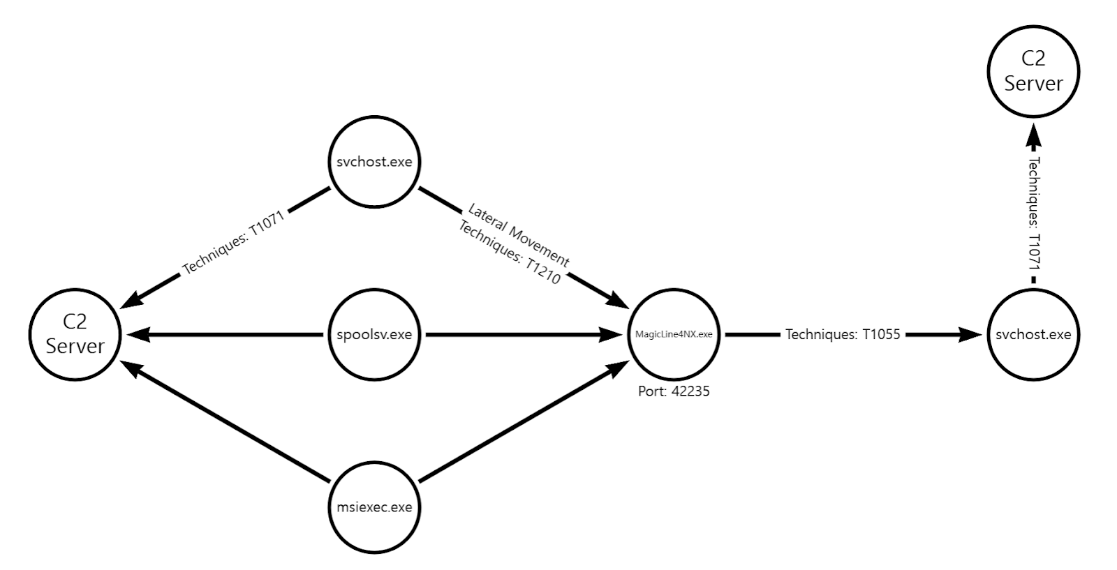 ○ 공격자는 기업내부로 침투한 후 목적에 맞게 공격을 지속합니다. 이후 내부확산을 위해 기업내부에서 관련 소프트웨어를 사용하고 있는 시스템을 스캔한 후 관련 소프트웨어(MagicLine4NX.exe)의 정상 서비스 포트(42235)가 확인되는 대상에게 원격 익스플로잇(Remote Exploit) 공격을 수행합니다.