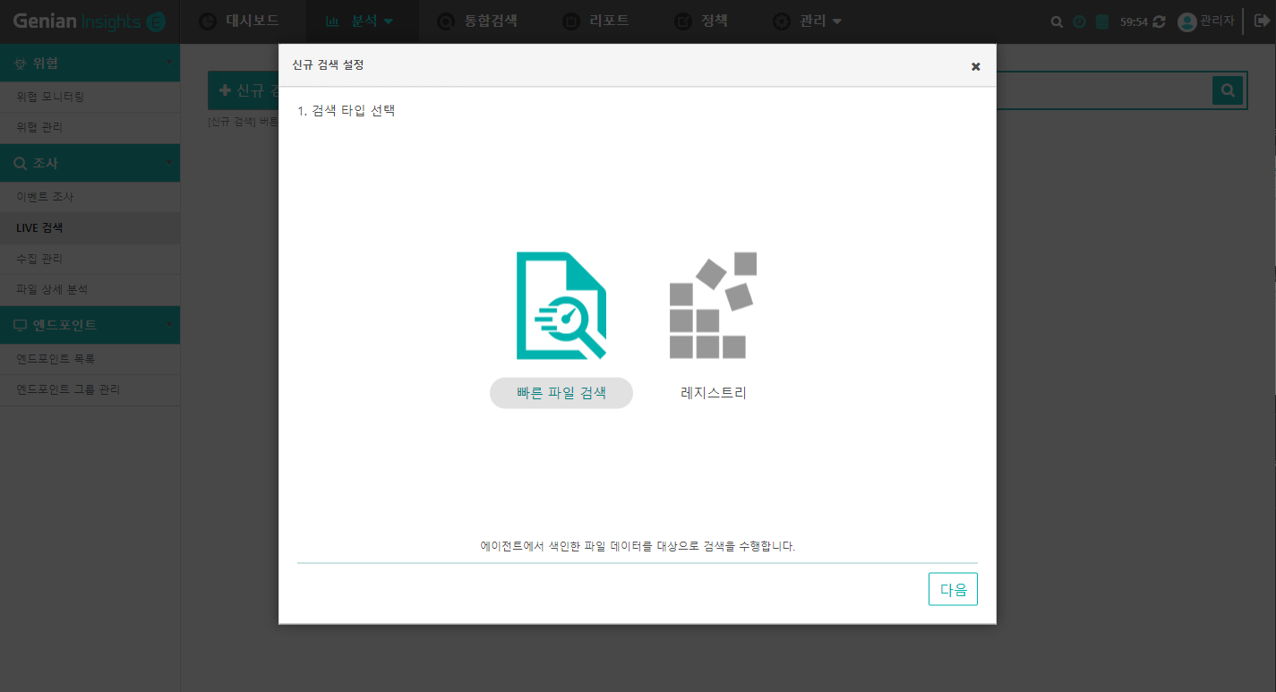 ○ Genian EDR 서버 관리자는 [분석] 메뉴의 좌측 하단 [조사] - [LIVE 검색] - [+ 신규 검색] - [빠른 파일 검색] 조건 설정을 활용할 수 있습니다.
