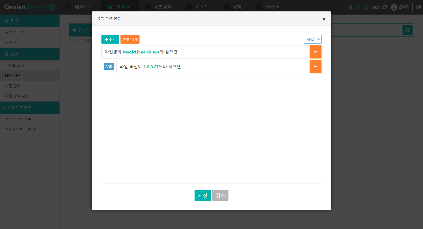 ○ 검색 조건을 통해 대상 파일명과 보안이 취약한 파일의 버전을 AND 조건으로 지정해 저장할 수 있습니다. 보안이 취약한 매직라인 파일 버전은 [1.0.0.26] 버전이하이므로, 파일명은 [MagicLine4NX.exe]로 지정하고, [1.0.0.27]보다 작으면 조건으로 저장하면 됩니다.