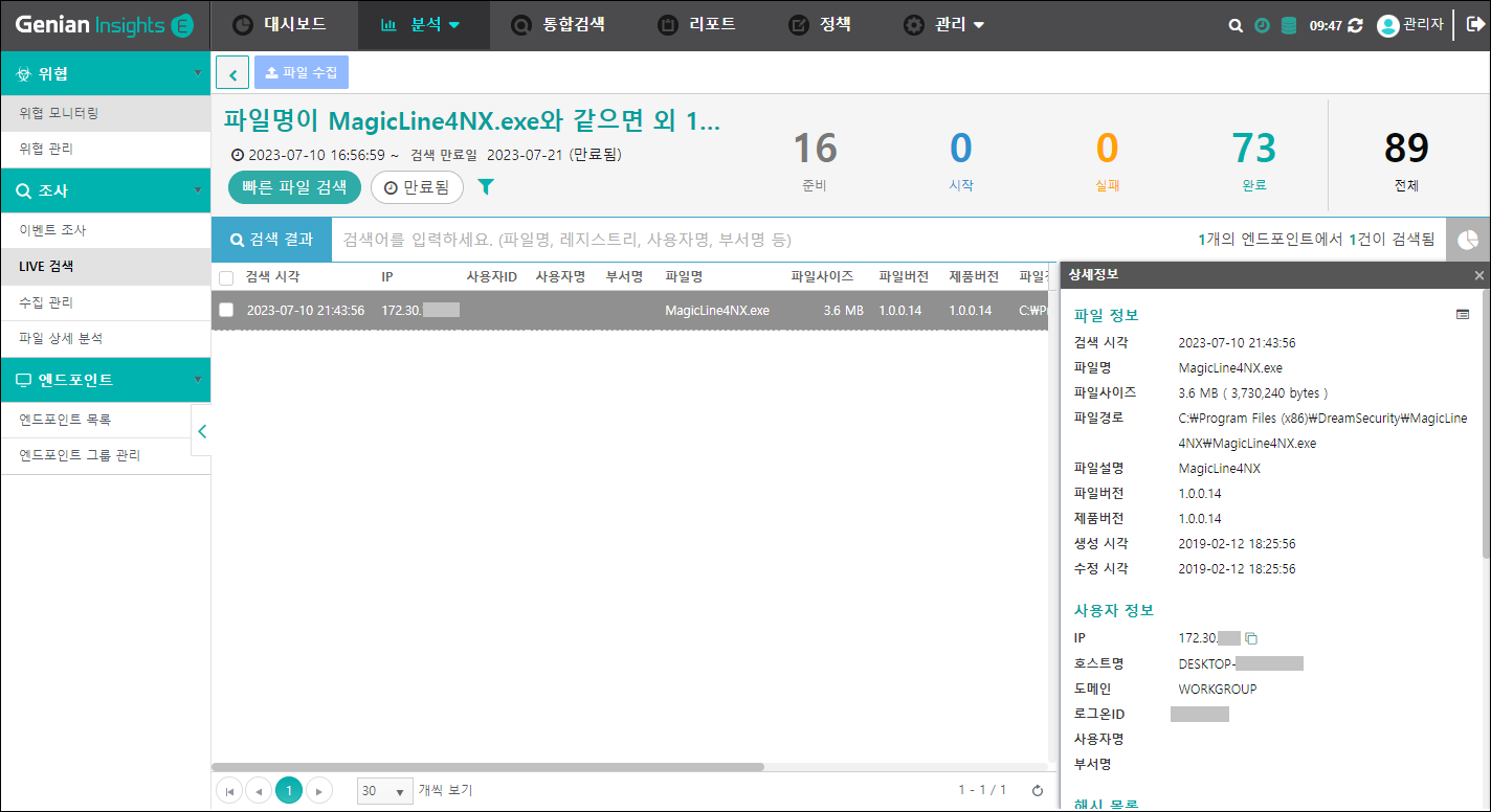 [그림3] LIVE 검색의 빠른 파일 검색 기능을 통한 취약한 매직라인 파일 조회