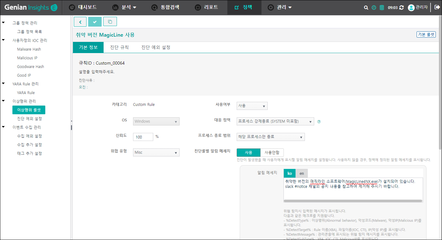○ '취약 버전 MagicLine 사용' 커스텀 룰을 등록하여 취약 버전 프로세스 강제 종료 정책 및 알림 메세지를 설정할 수 있습니다.