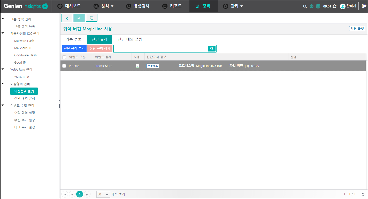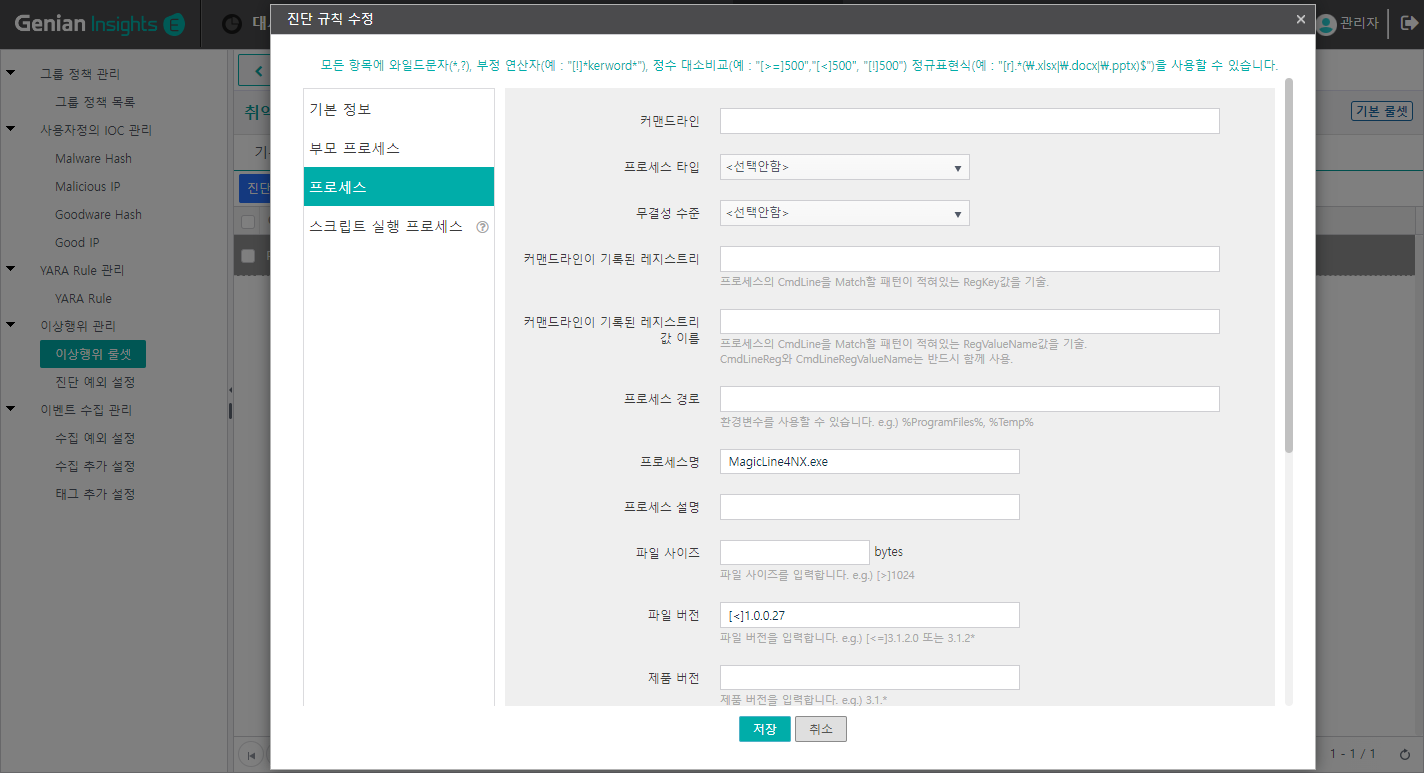 ○ 보안이 취약한 매직라인 파일 버전은 [1.0.0.26] 버전이하이므로, 탐지 조건으로 파일명은 [MagicLine4NX.exe]로 지정하고, [1.0.0.27]보다 작으면 조건으로 저장하면 됩니다.