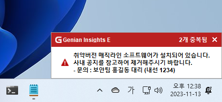 ○ <프로세스 강제종료 (SYSTEM 미포함)> 대응 정책을 설정하고, 취약한 버전이 설치된 단말의 사용자에게 지정한 알림 메세지를 전달할 수 있습니다.