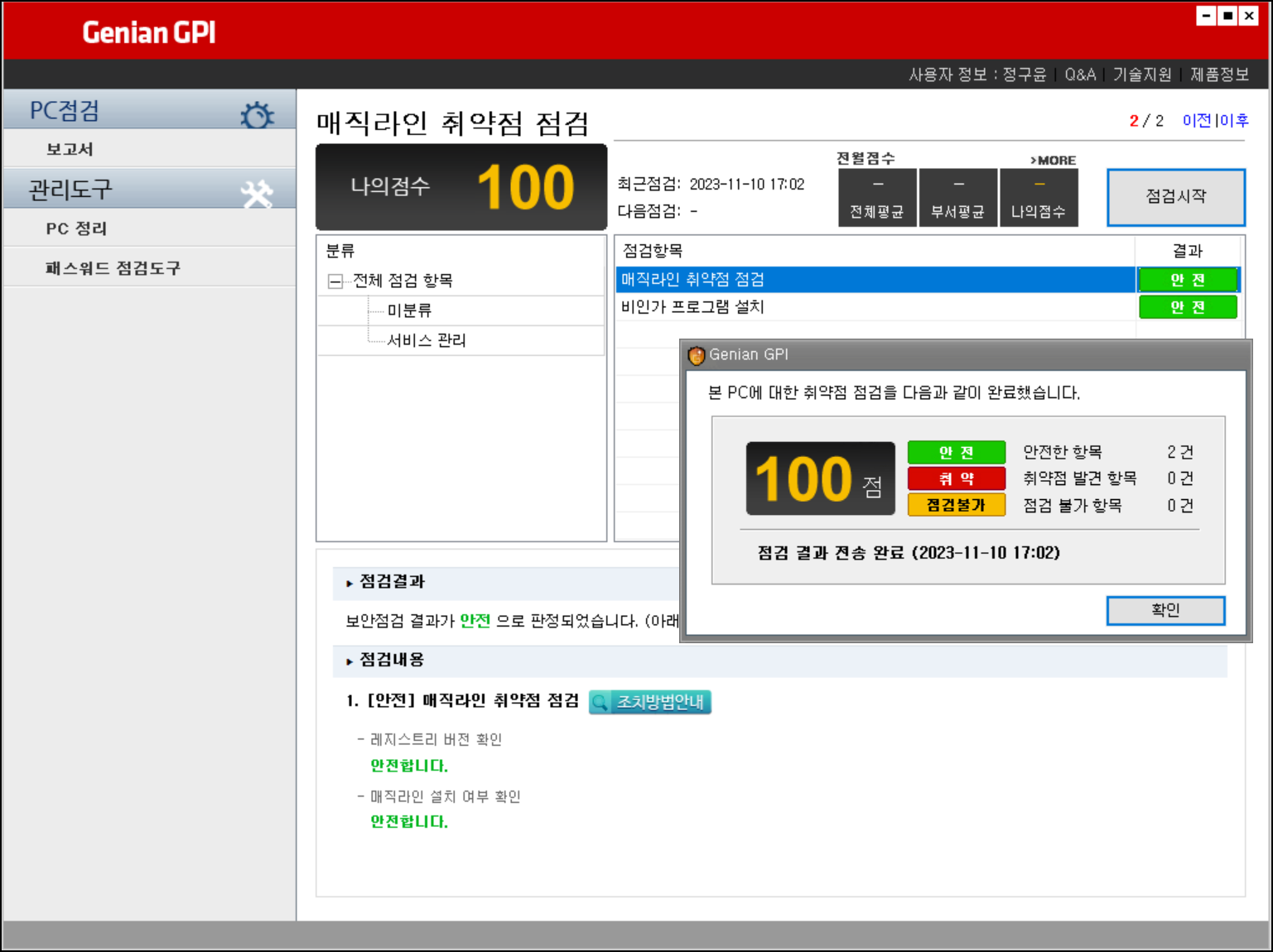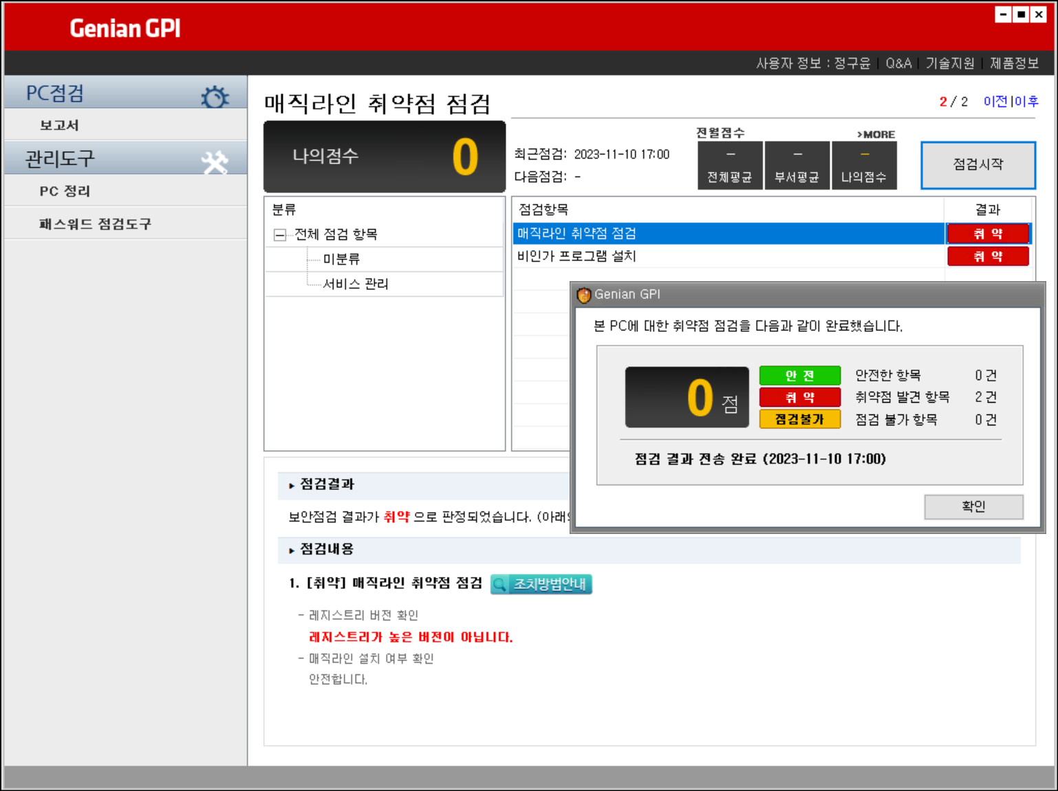 ○ 사용자가 직접 매직라인에 대해 조치를 취하고 재 점검 시 안전한 결과를 확인할 수 있습니다. 사용자들이 직접 점검한 결과는 관리자 페이지에 기록되어 한눈에 확인이 가능합니다.