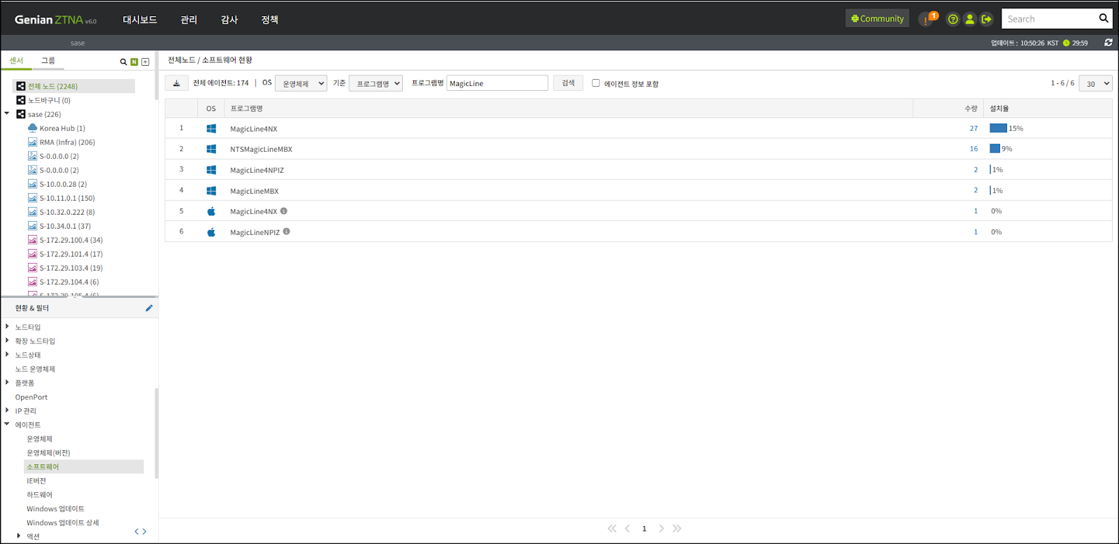 ○ 단말에서 수집 된 모든 소프트웨어 중 매직라인이 설치 된 현황을 검색합니다.