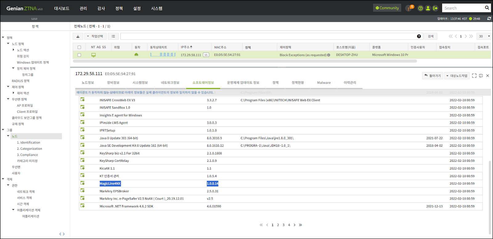○ Genian NAC Agent를 통해 단말에 설치 된 소프트웨어 정보를 수집하여 취약한 매직라인 모듈이 설치되어 있는 대상을 그룹화 시킵니다.