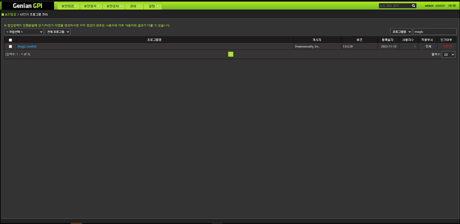 [그림18] 비인가 프로그램 관리 메뉴를 통해 MagicLine4NX 비인가 지정