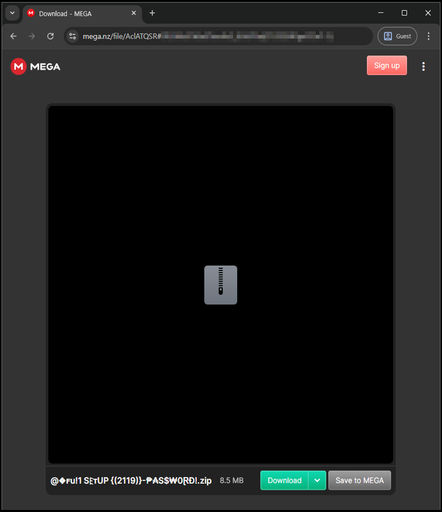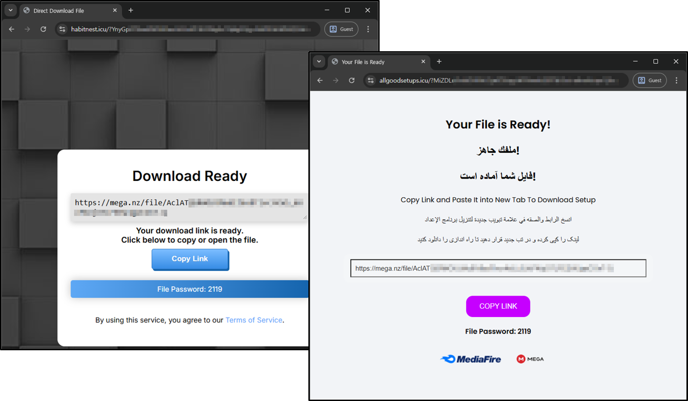최종적으로 다운로드가 이루어지는 호스트는 MEGA 클라우드입니다. 공격자는 합법적 클라우드 서비스를 유포 인프라로 활용함으로써 IP/도메인 차단을 우회하려는 것으로 보입니다.
