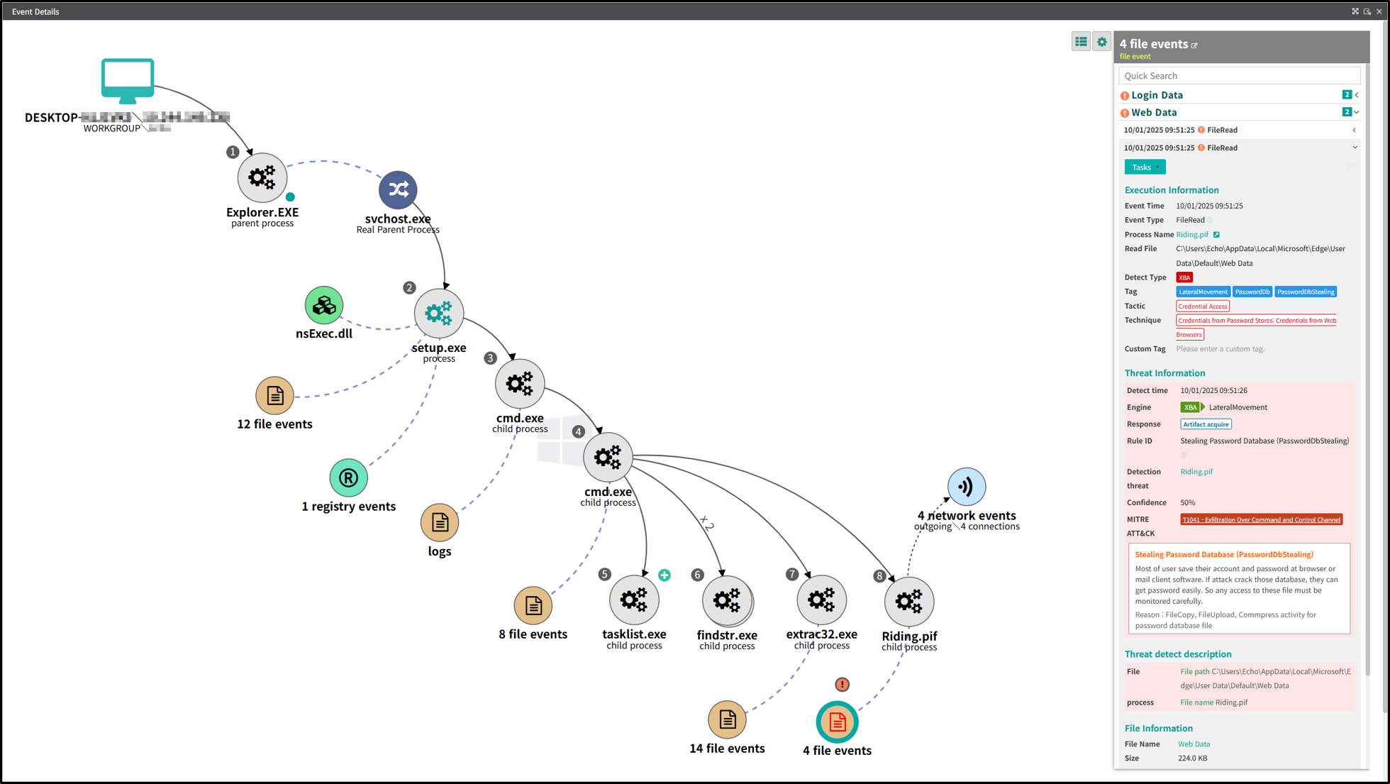 이러한 위협을 식별하기 위해서는 단말에서 발생하는 파일 및 프로세스 이벤트를 조사하고, 그에 따른 실행 흐름을 분석해야 합니다.