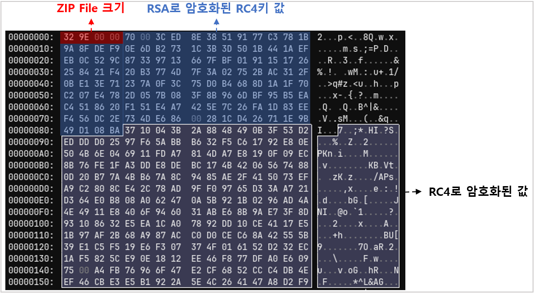○ 이후 해당 ZIP 파일은 암호화되어 '{난수}.tmp.zip.enc' 파일이 생성되며, 이 파일은 압축 파일 크기, RSA로 암호화된 RC4 키, RC4로 암호화된 ZIP 파일 데이터로 구성됩니다.