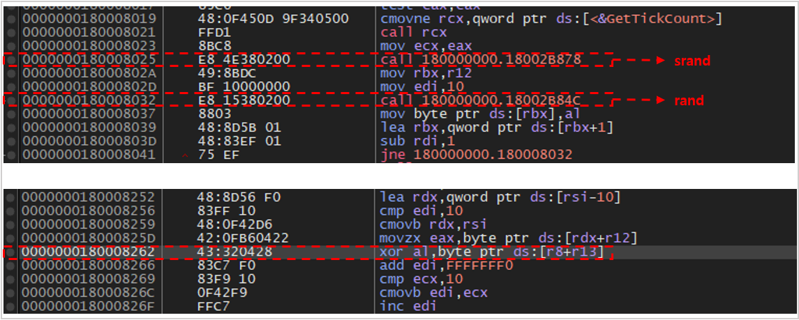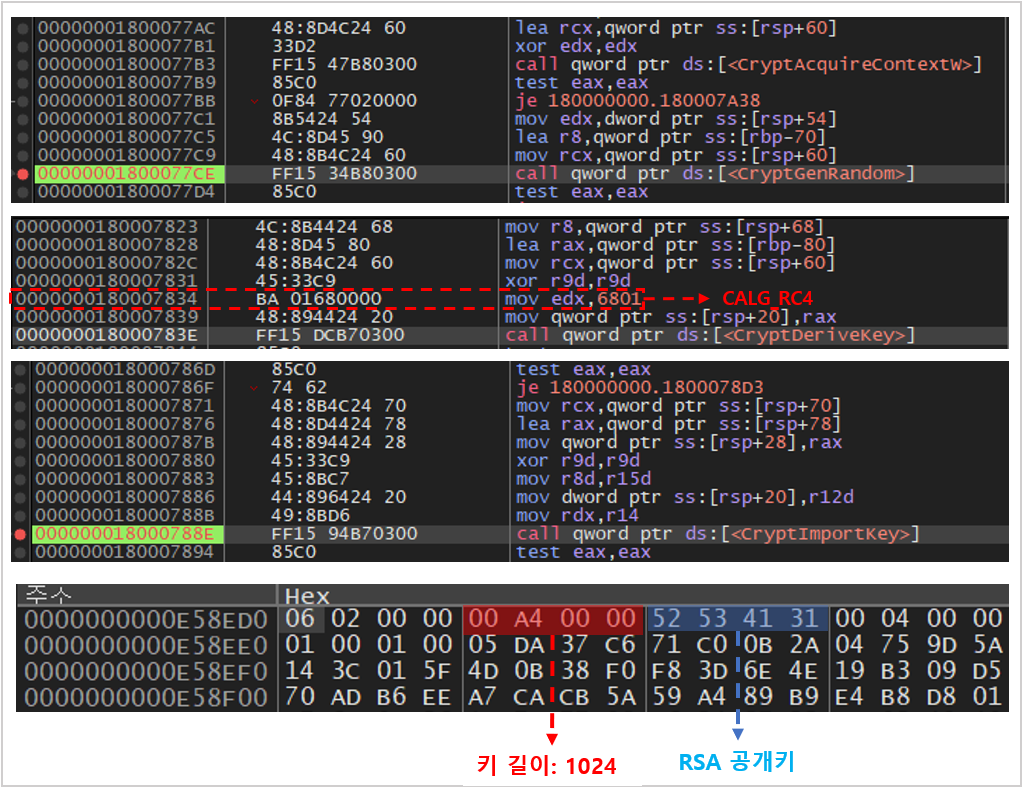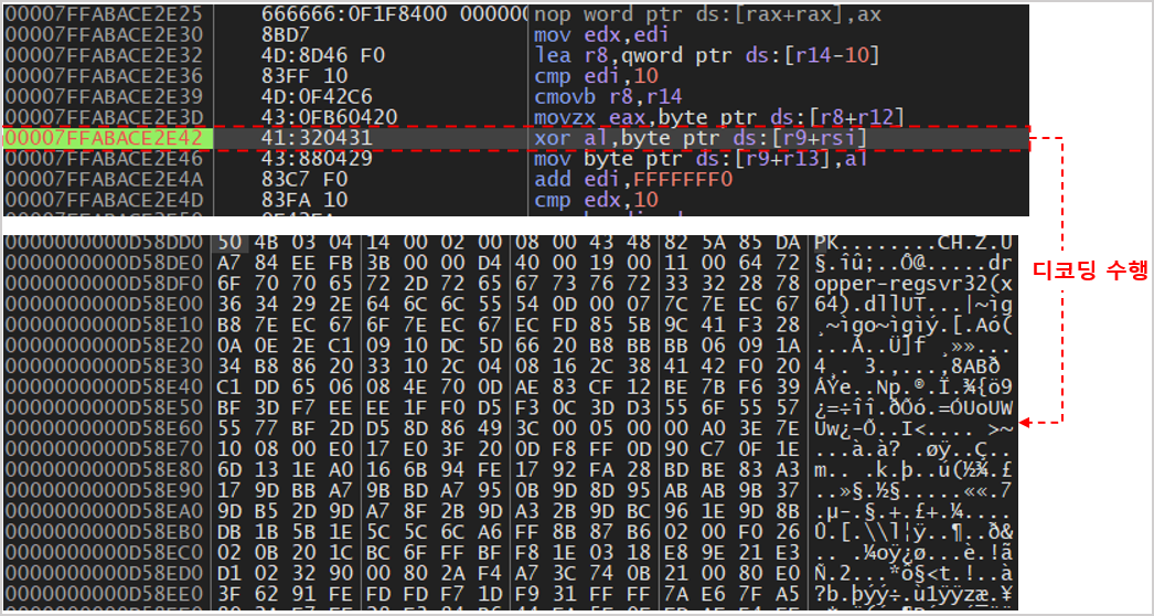 ○ 이 난수는 이후 .enc 파일 내 데이터에 대해 XOR 암호화를 수행하는 키로 사용되며, 생성된 키는 반복적으로 순환 참조되어 암호화에 사용됩니다.