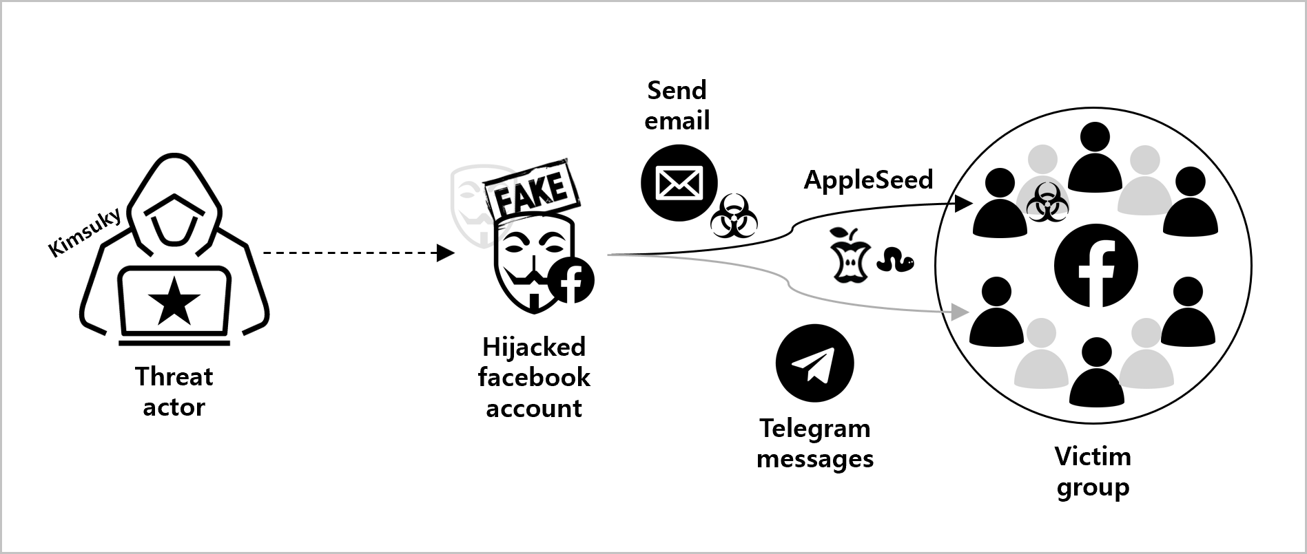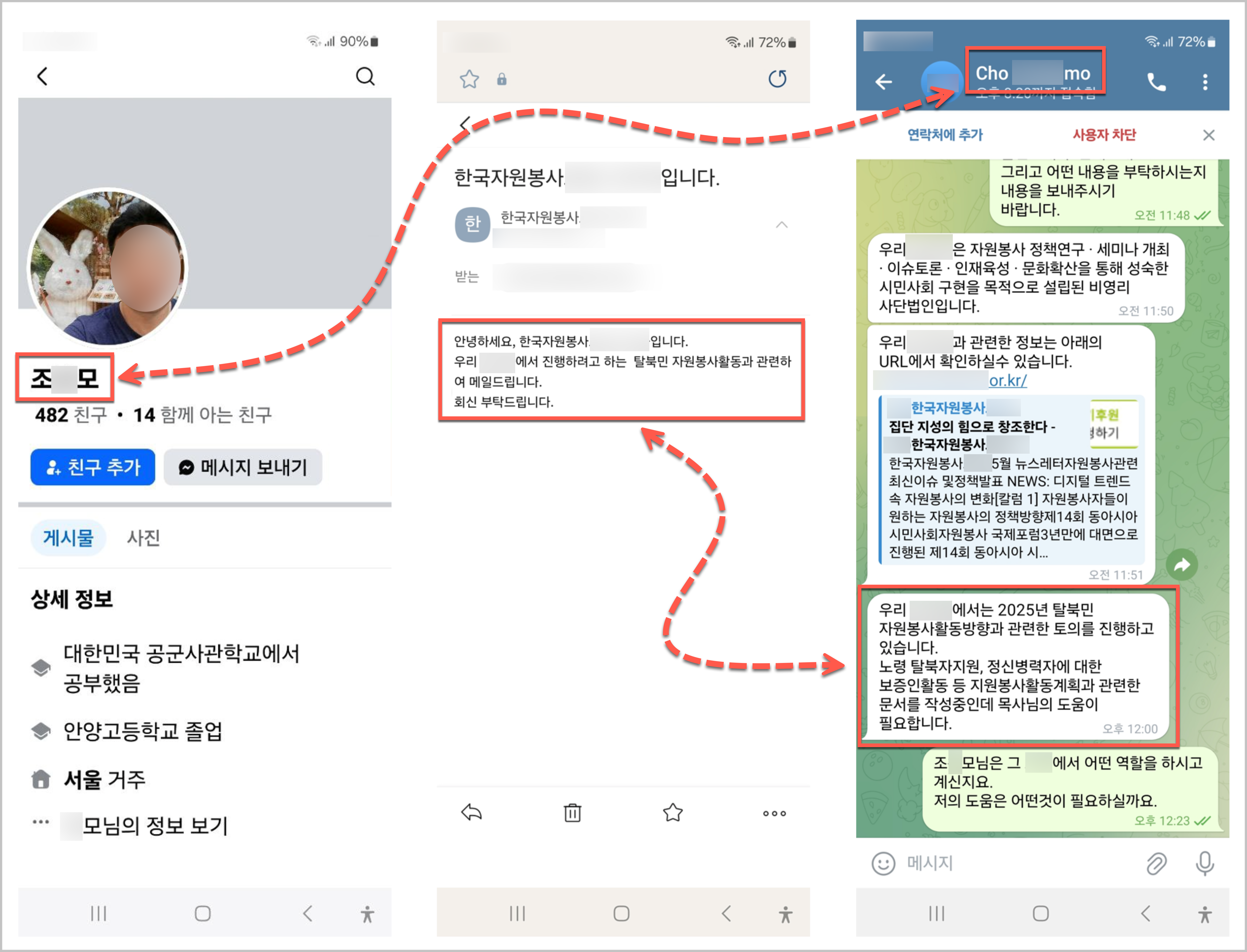 - 페이스북, 이메일, 텔레그램 등 3단계 통로를 이용한 은밀한 침투 전략 구사
