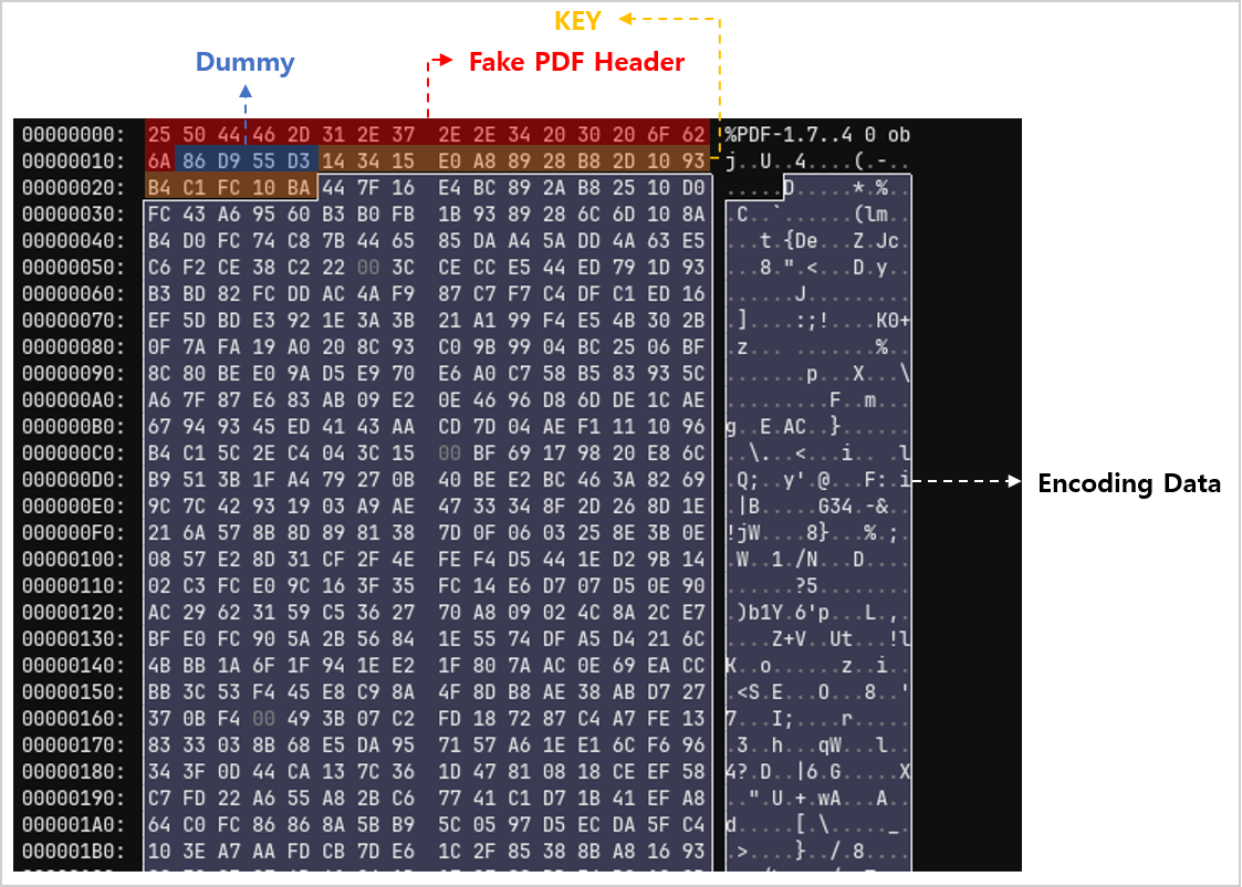 ○ 이후 PDF 헤더, 더미 값 4바이트, 16바이트 XOR 키, 인코딩된 enc 파일의 내용으로 구성된 '{난수}.pdf' 파일을 생성합니다. 전체 구조는 '[그림 4-11] 난수 tmp 파일 구조'와 같습니다.