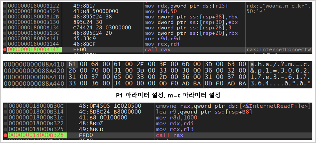 ○ 생성된 문자열은 C2 서버로 전송되는 HTTP 요청의 'p1' 파라미터에 포함합니다. 'm' 파라미터의 'b' 값은 데이터 전송을 의미합니다.