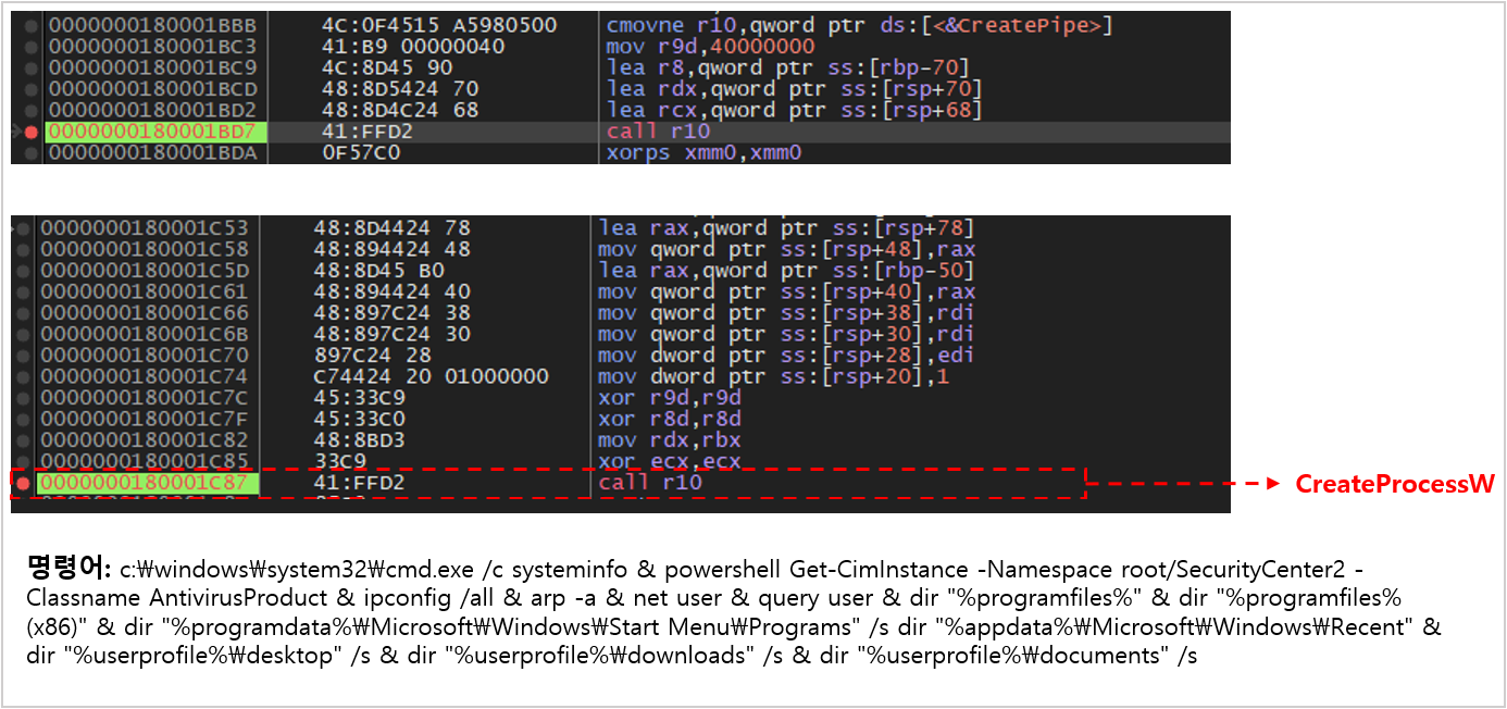 ○ 'DllInstall' 함수가 실행되면, 앞 과정과 동일하게 파라미터 검증 과정을 수행한 후, 'CreateProcessW' 함수를 통해 추가적인 명령어를 실행합니다.