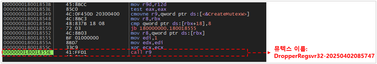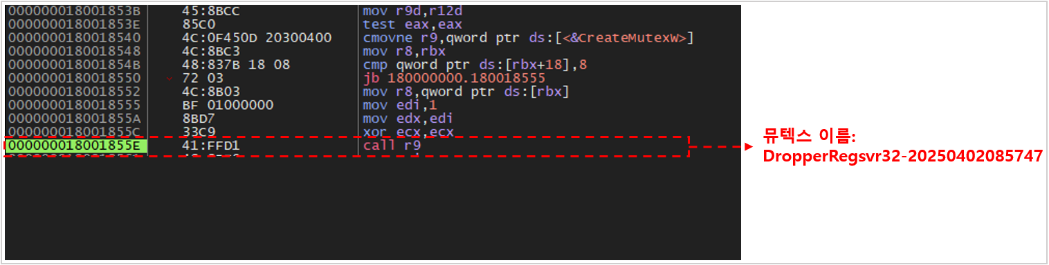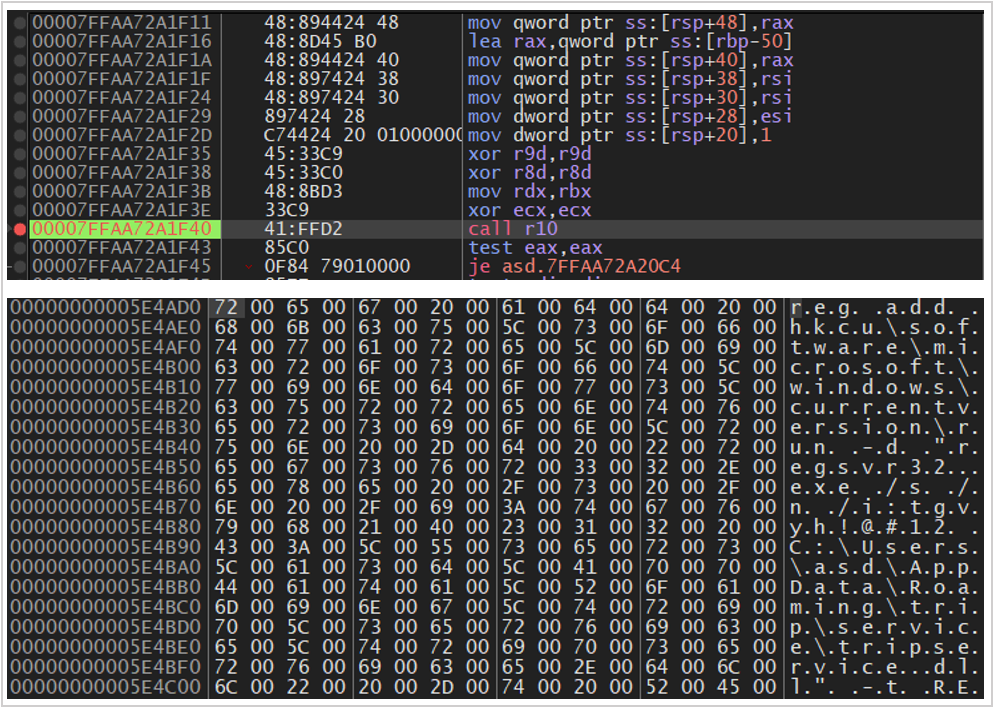 ○ 'CreateProcessW' 함수의 인자 값으로 전달되는 명령어는 사용자 실행 레지스트리(HKCU\...\Run)에 'TripServiceUpdate' 항목을 등록하고, 시스템이 재부팅될 때마다 'regsvr32.exe'를 통해 악성 DLL을 자동 실행하도록 설정합니다.