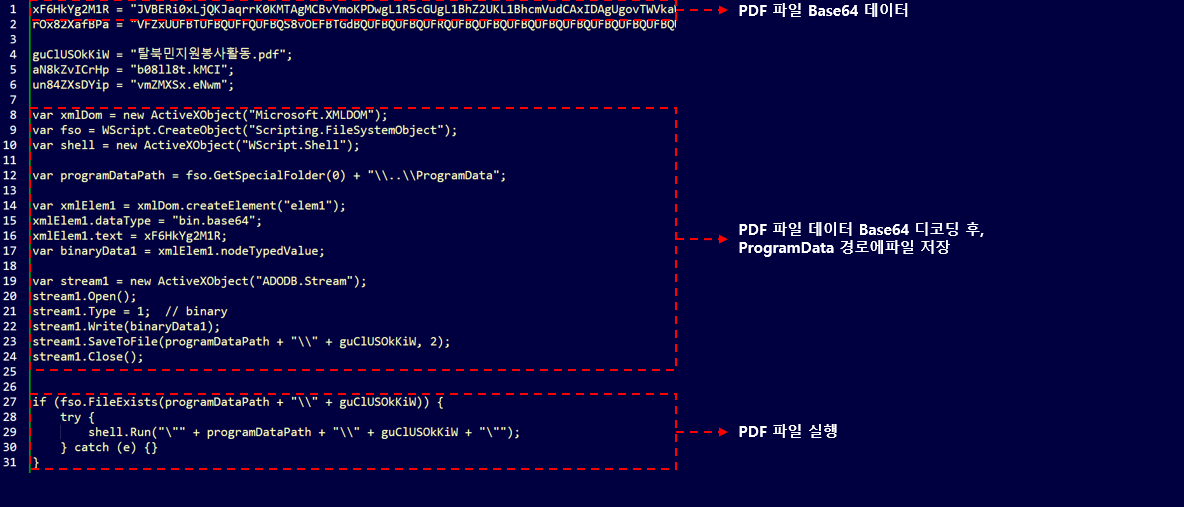 ○ 스크립트 내부에는 xF6hKgM2MlR 변수에는 Base64로 인코딩된 PDF 파일의 데이터가 저장되어 있으며, guC1USOkKiW 변수는 복호화 후 생성될 파일 이름인 "탈북민지원봉사활동.pdf"이 저장됩니다.