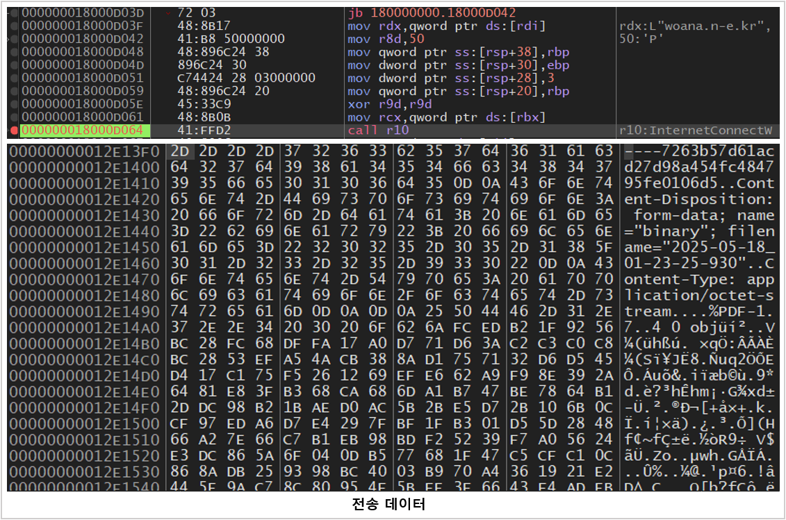 ○ 'woana.n-e[.]kr' 도메인으로 HTTP 요청을 전송하며, 이전에 설정한 파라미터와 함께 '{난수}.pdf' 파일의 데이터를 'multipart/form-data' 형식으로 구성하여 전송합니다.