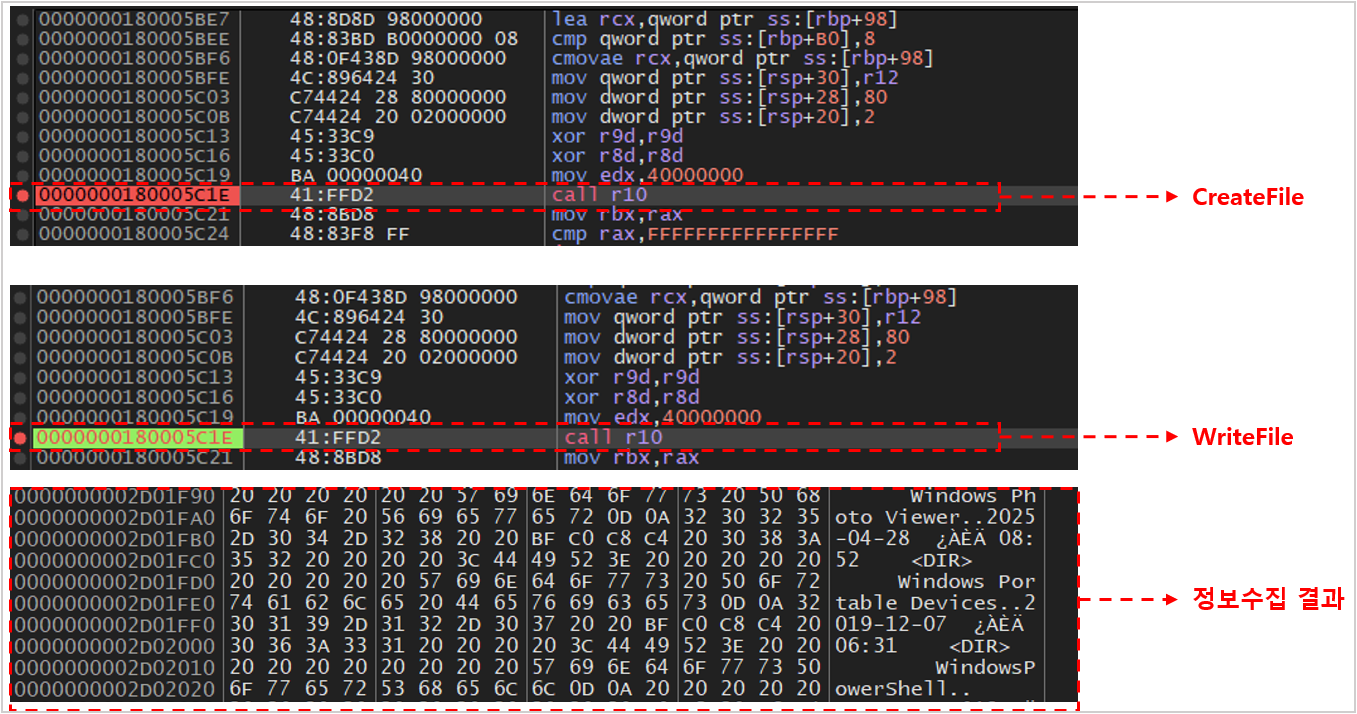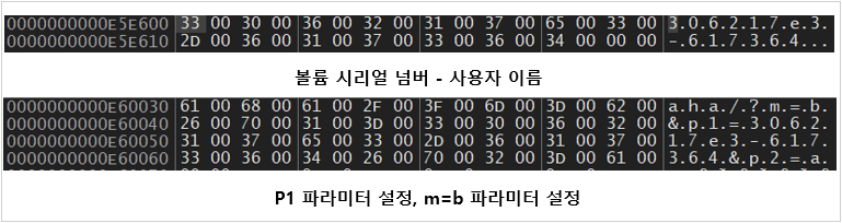 ○ 감염된 단말의 드라이브 볼륨 시리얼과 사용자 이름을 기반으로 고유 식별 문자열을 생성합니다. 사용자 이름은 한 글자씩 16진수로 변환되며, 최종적으로 '볼륨 시리얼-사용자 이름(16진수)' 형식의 문자열을 만듭니다.