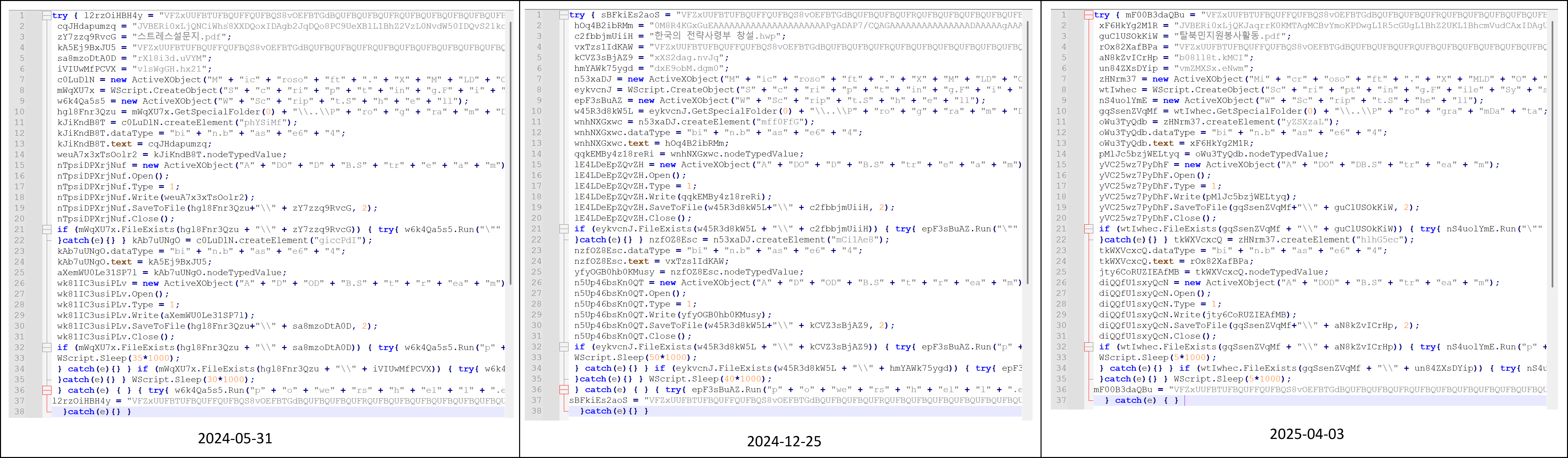 ○ 2024년 5월과 12월 그리고 2025년 4월 사례를 비교해 보면, 거의 동일한 패턴으로 악성 스크립트가 사용된 것을 알 수 있습니다. 위협 행위자는 자동화된 악성 스크립트 제작 도구를 활용하고 있을 가능성이 큽니다.