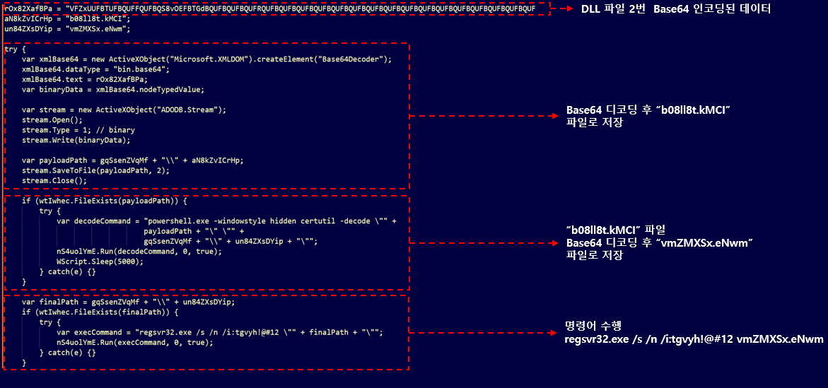 ○ DLL 파일의 데이터는 2 차례 Base64 인코딩된 상태입니다. Microsoft.XMLDOM 객체(xmlDom)를 이용해 첫번째 디코딩 수행 후, 파워쉘을 통해 certutil을 실행하여 총 두 단계의 디코딩 과정을 수행합니다.