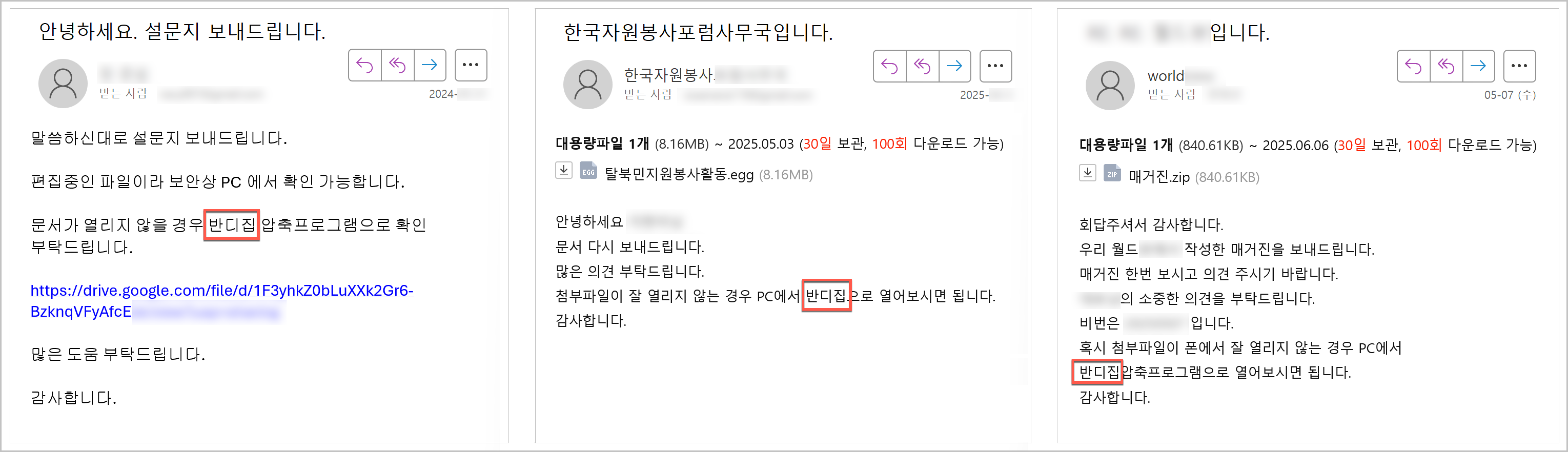 ○ 한편, 스피어 피싱(Spear Phishing) 공격에 쓰인 첨부파일은 상대적으로 EGG ALZIP 포맷이 자주 목격됐습니다. 위협 행위자는 이메일을 통해 특정 압축 해제 프로그램 사용을 권장하기도 합니다. 이는 이메일 및 단말에 설치된 보안 제품의 시그니처 탐지 회피 동시에 스마트폰이 아닌 PC 환경에서 악성파일을 열도록 유인하는 전략이기도 합니다.