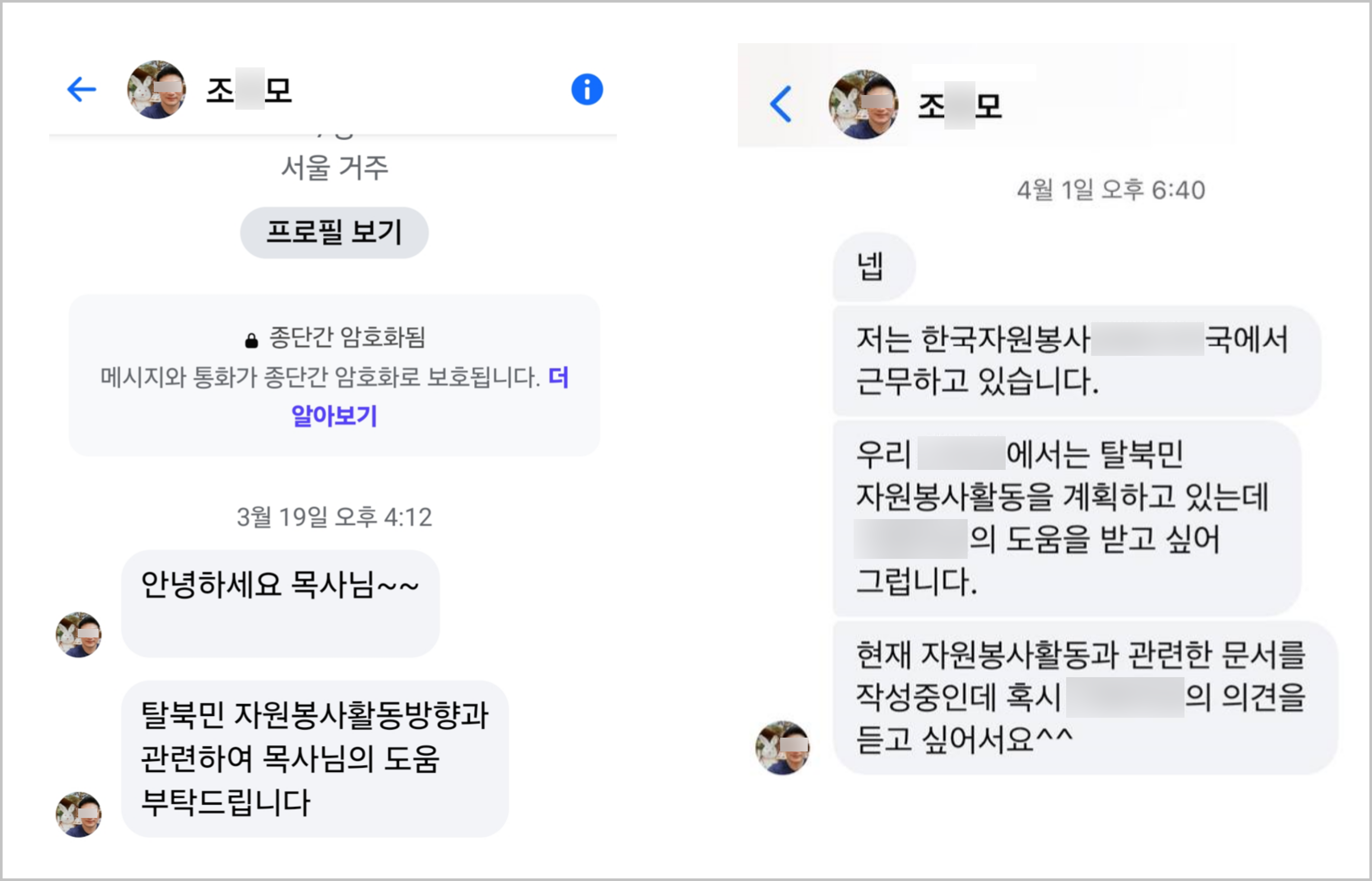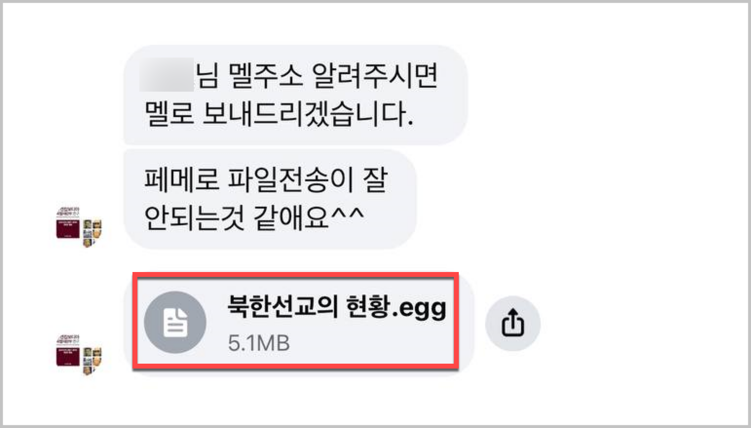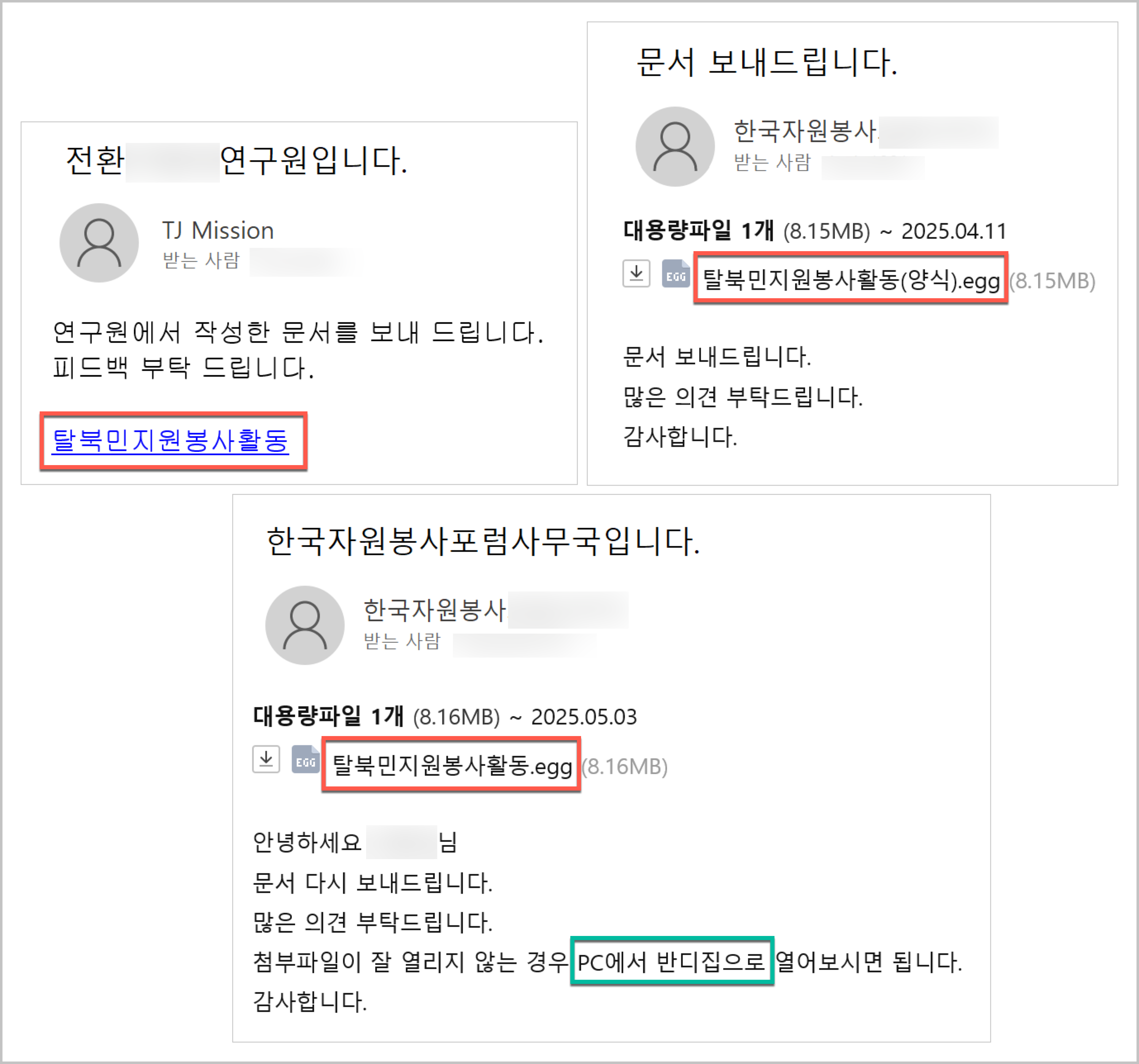 - 마치 탈북민 자원봉사 활동 내용처럼 현혹해 대화 유도 및 악성파일 전달