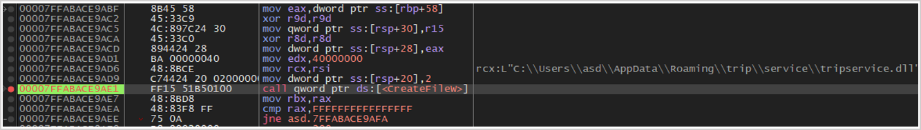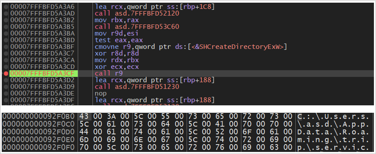 ○ 이후 'C:\Users\[사용자명]\AppData\Roaming\trip\service\' 경로에 악성 DLL(tripservice .dll)을 저장하기 위한 디렉터리가 생성됩니다. 해당 경로는 앞서 등록된 자동 실행 레지스트리(HKCU\...\Run)에서 참조되는 위치입니다.