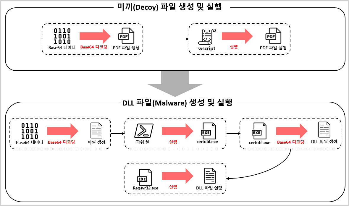 ○ 과거 【AppleSeed】 유형을 보면, 실행파일 확장자(EXE, PIF 등)가 쓰인 경우가 다수 보고됐습니다. 특히, 스크립트 유형(JSE, WSF, JS 등)의 파일을 이용한 공격빈도가 많은 편에 속하며, Base64 문자로 인코딩된 악성 DLL 라이브러리를 호출하는 특징을 보입니다.