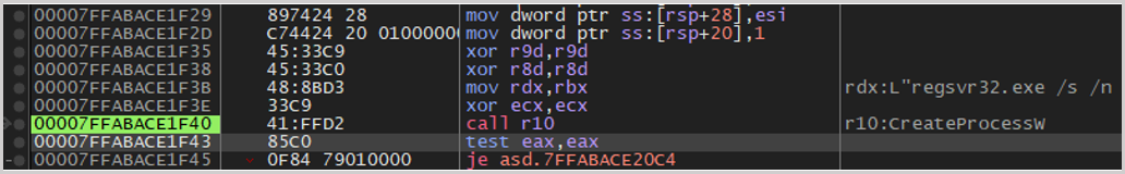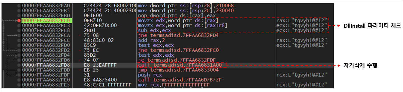 ○ 'regsvr32.exe /s /n /i:tgvyh!@#12 vmZMXSx.eNwm' 인자 값으로 실행되면 'vmZMXSx.eNwm' 파일의 DllInstall 함수를 호출하며, 파라미터로 'tgvyh!@#12' 문자열을 전달합니다.