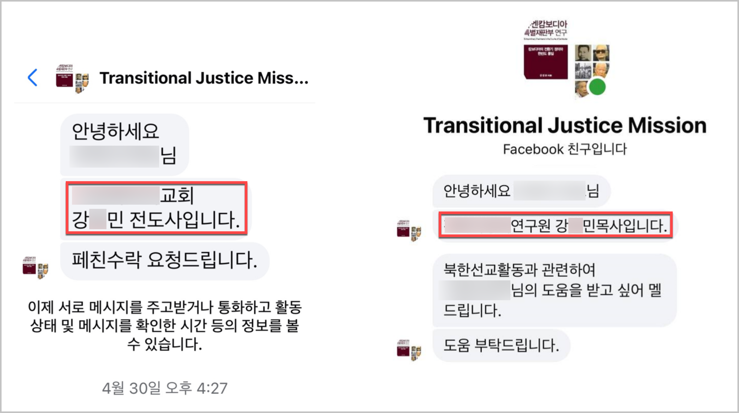 ○ 먼저 페이스북 기반으로 접근했던 공격 사례입니다. 위협 행위자는 'Transitional Justice Mission' 계정을 통해 대북분야 종사자 다수에게 온라인 친구 신청 및 메신저로 대화를 신청했습니다.