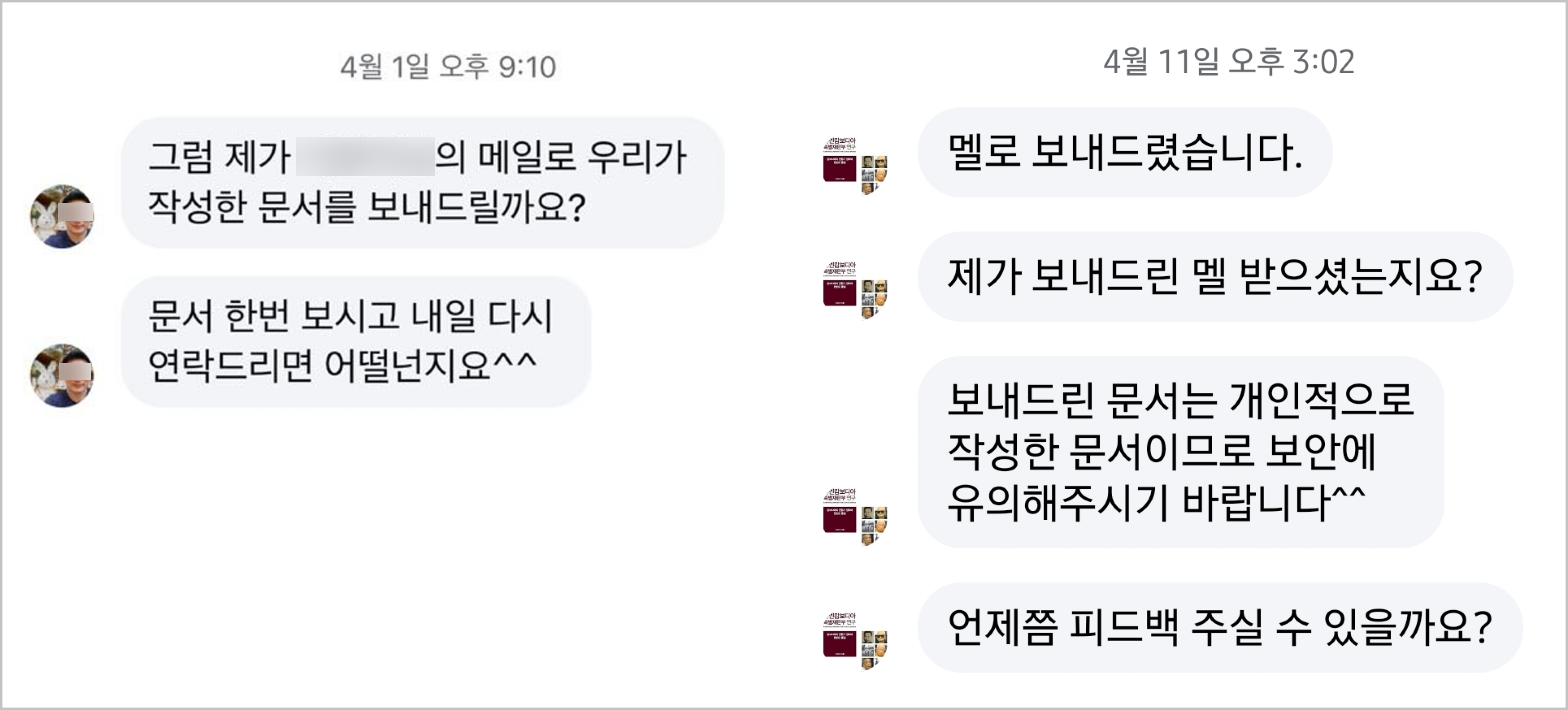 ○ 아울러 대화 메시지에 포함된 한글 표현을 살펴보면, 일부 축약식 표현과 오탈자가 관찰됩니다. 이는 대화형 AI 서비스나 온라인 번역기를 통한 것이 아님이 분명합니다.