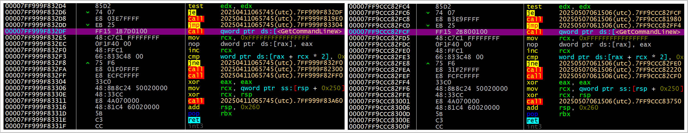 ○ 2025년 4월과 5월에 공격된 악성파일의 함수를 비교해 본 화면입니다. 위협 행위자는 변종에 따라 코드를 변경하고 있지만, 비슷한 시기의 악성파일은 유사한 형태를 가지고 있습니다.