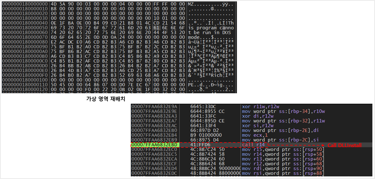 ○ 이후 이 디코딩된 DLL 데이터는 가상 메모리 영역에 동적 할당 로드 및 재배치되며, 메모리 상에 수동으로 섹션을 구성한 뒤, 최종적으로 해당 DLL의 'DllInstall' 함수를 호출합니다.