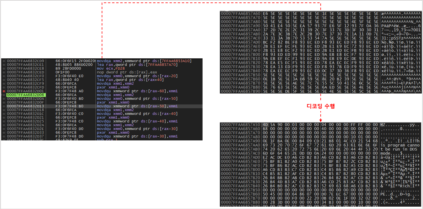 ○ 파라미터 검증이 완료되면, '.data' 섹션의 오프셋 0xA0 위치에 존재하는 값을 기준으로 디코딩 절차가 수행됩니다. 해당 디코딩은 0x5E 값을 키로 하여 XOR 방식으로 진행되며, 디코딩이 완료되면 VMP 보호가 적용되지 않은 원본 DLL 바이너리 데이터가 '.data' 섹션의 동일 오프셋에 존재하게 됩니다.