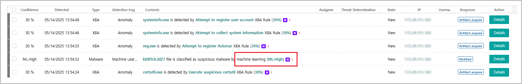 [그림 6-1] Genian EDR 제품의 머신러닝 탐지 모습