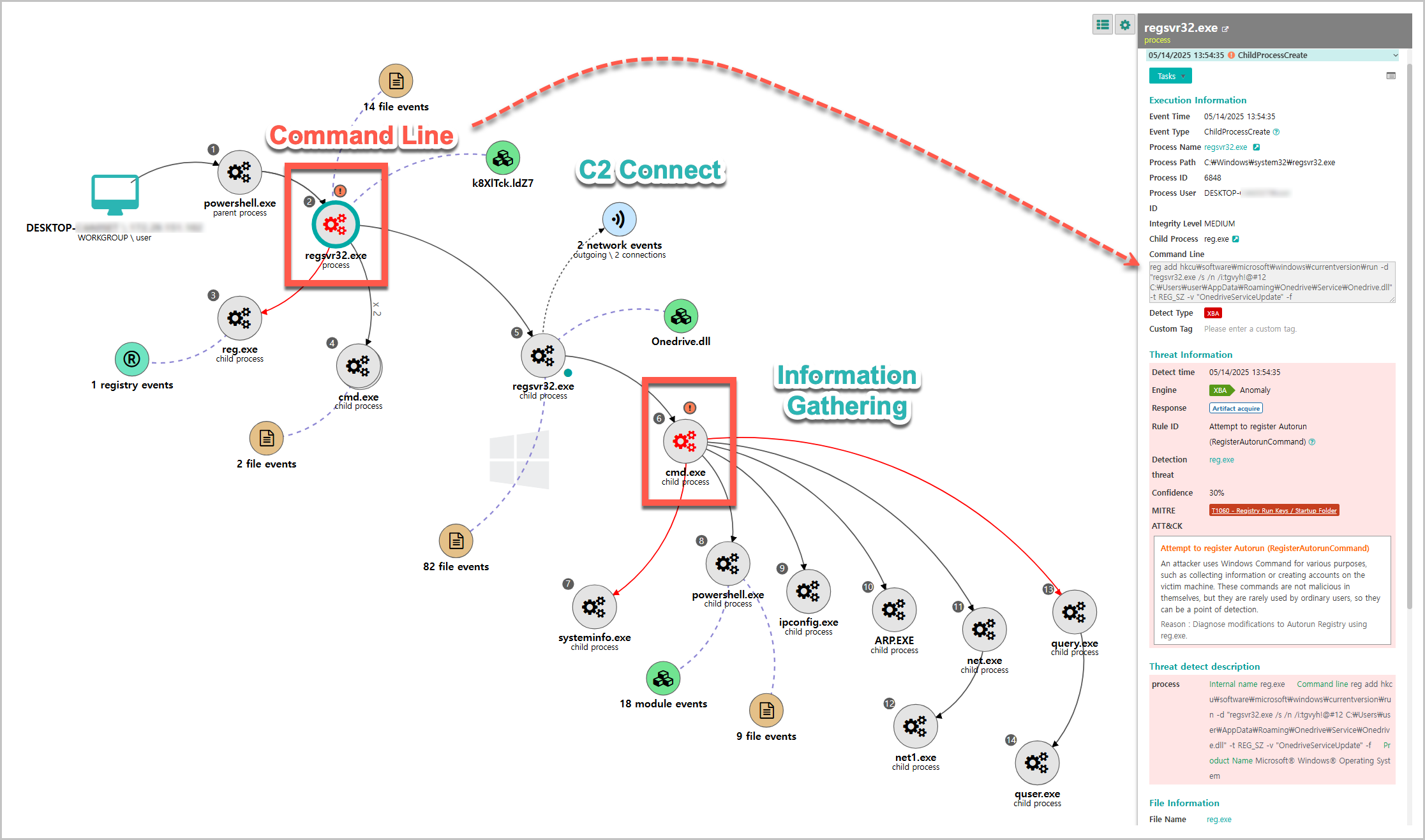 ○ DLL 파일은 'regsvr32.exe /s /n /i:tgvyh!@#12 vmZMXSx.eNwm' 명령어를 통해 사일런트 모드로 실행됩니다. 이 과정을 통해 악성 DLL이 시스템에 로드되며, 이후 악성 행위가 수행됩니다.