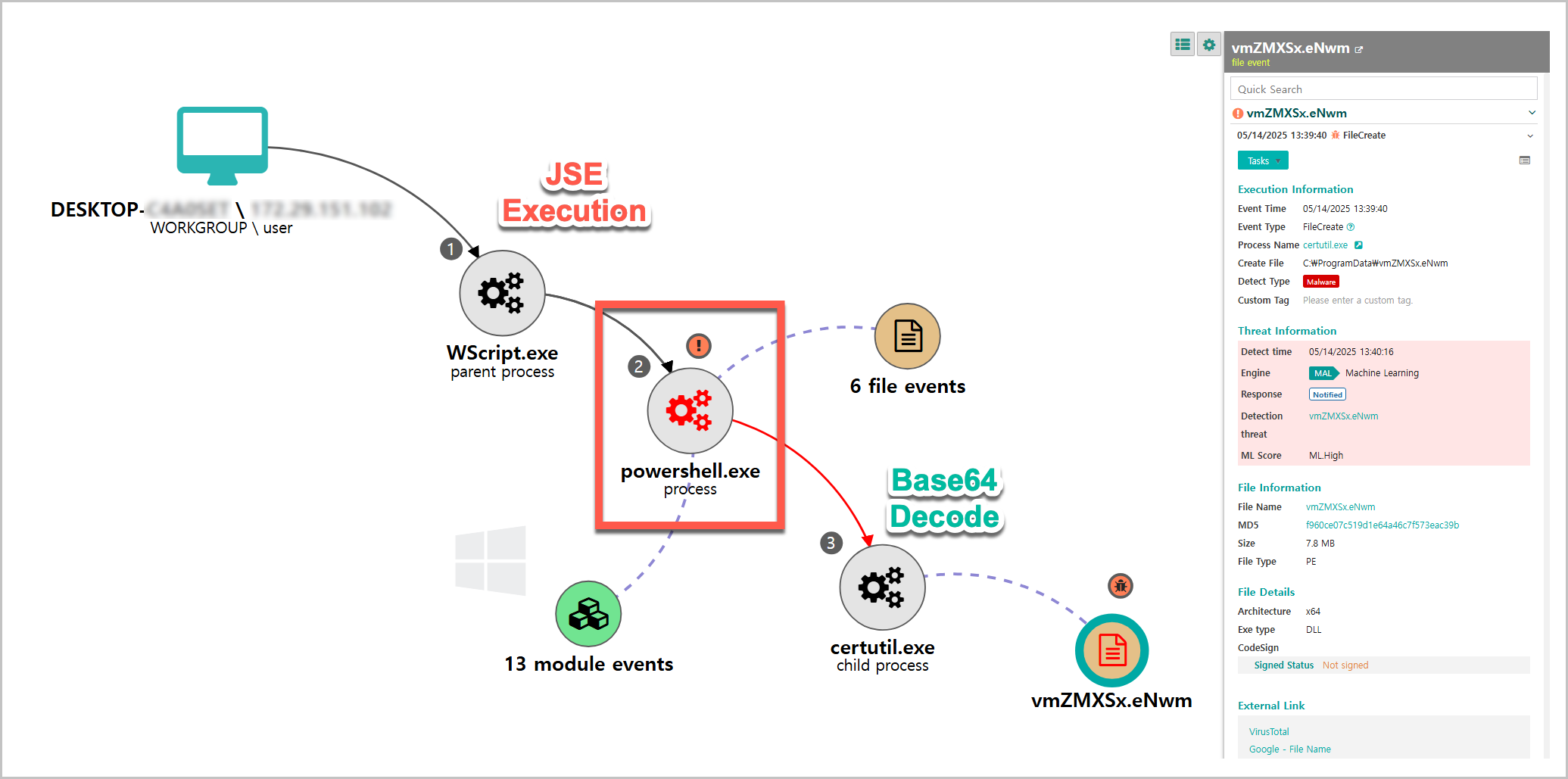 ○ 보통 JSE 유형의 악성파일은 'WScript.exe' 프로세스에 의해 동작이 시작됩니다. 그 이후에 'PowerShell.exe' 명령 등을 통해 다양한 위협 이벤트가 발생하게 됩니다.