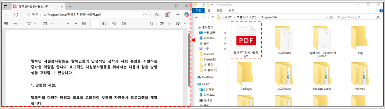 ○ '탈북민지원봉사활동.jse' 파일은 실행 시 두 개의 파일을 생성합니다. 하나는 정상적인 PDF 문서로, 사용자를 속이기 위한 미끼(Decoy) 파일이며, 다른 하나는 실제 악성 동작을 수행하는 DLL 파일입니다.