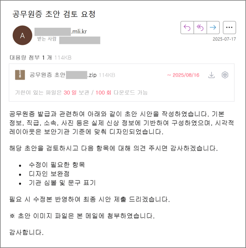 On July 17, 2025, the Genians Security Center (GSC) detected a spear-phishing attack attributed to the Kimsuky group. This was classified as an APT attack impersonating a South Korean defense-related institution, disguised as if it were handling ID issuance tasks for military-affiliated officials.