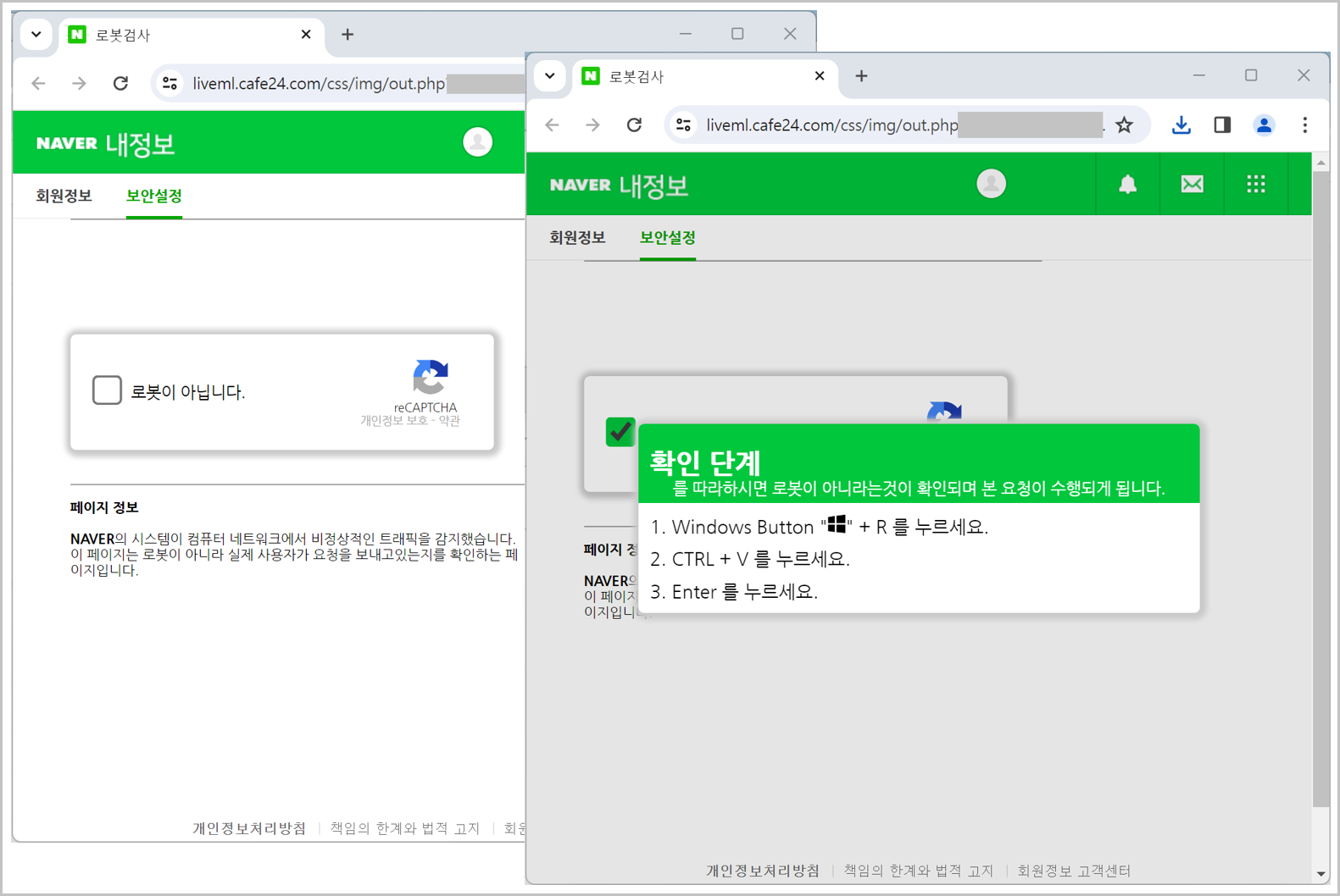 Credential theft phishing attacks were also observed in addition to the ClickFix tactic, this time using the address 'snuopel.cafe24[.]com' instead of 'liveml.cafe24[.]com.'