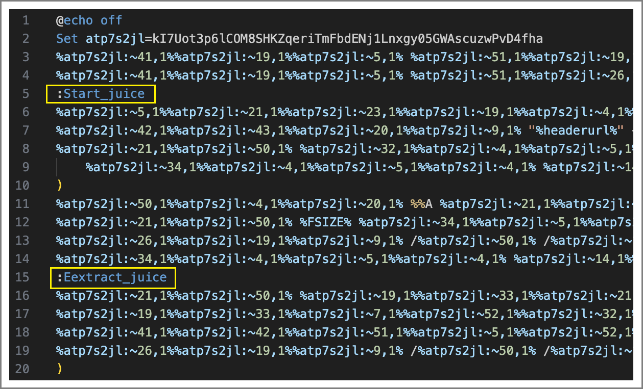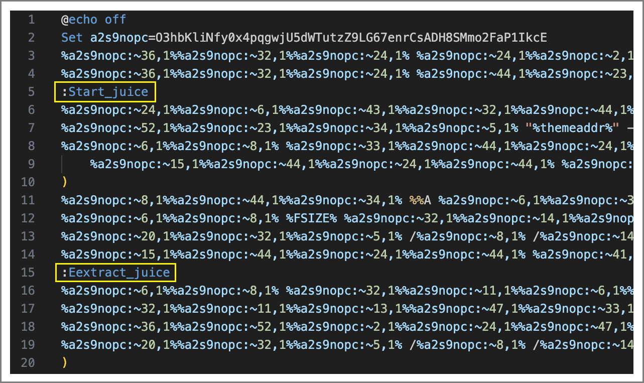 The strings 'Start_juice' and 'Eextract_juice,' used as identifiers for internal branch jumps, have continued to appear in similar cases. This information is separately applied in "Threat Attribution" and correlation analysis.