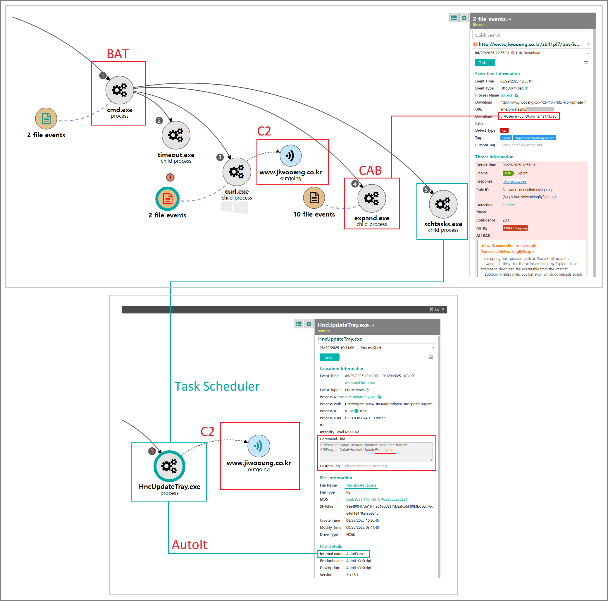 Inside the CAB file was a file named 'HncUpdateTray.exe,' disguised as a Hancom Office update. The file was in fact 'AutoIt3.exe,' which functioned to execute a compiled AutoIt script named 'config.bin.' The script communicated periodically with the 'jiwooeng.co[.]kr' C2 server and executed new batch file commands according to the attacker’s intent.