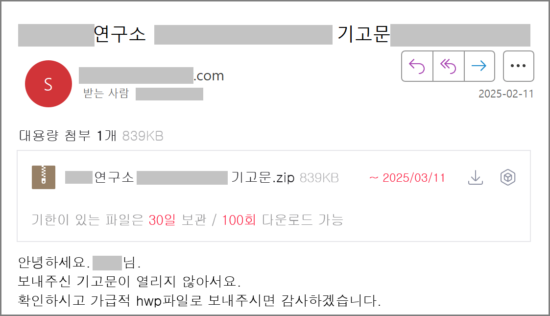[Figure 3-4] ClickFix Attack Email Disguised as an HWP Document Attachment