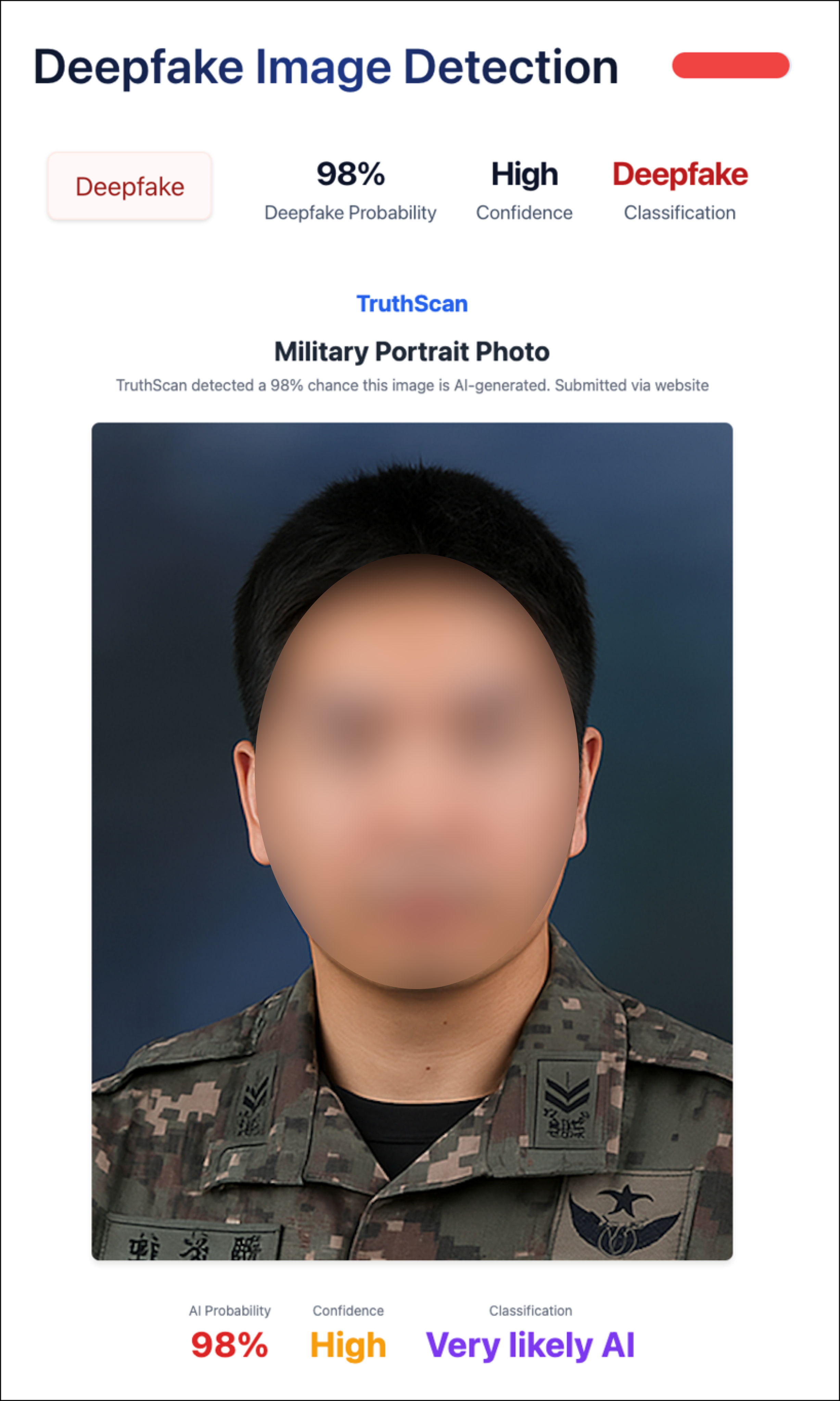 We analyzed the file '공무원증 초안(***).png,'(Government_ID_Draft(***).png) used in the attack, with the TruthScan Deepfake-detector service and identified it as a deepfake image with a 98% probability.